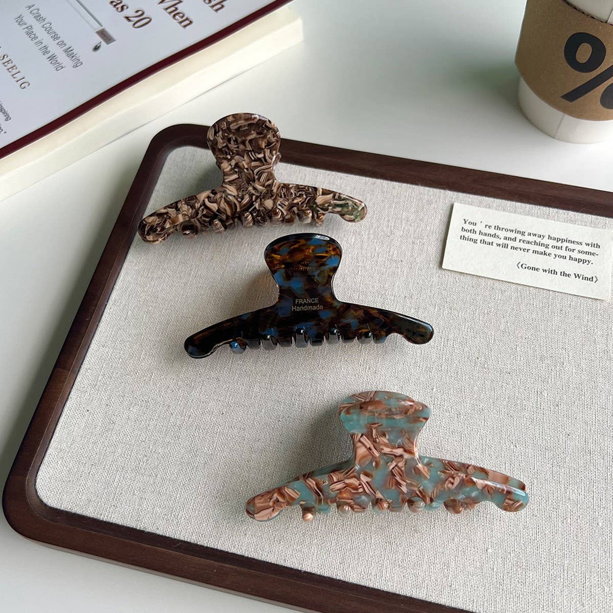 ? Size: 10 cm x 4 cm / 3.94 in x 1.57 in\n? Weight: 18.5 g\n? Material: Acetate\n? Design Elements: Elegant mix of blue coffee, coffee green, coffee floral, and brown stripe colors ????\n? Style: Sophisticated and timeless, perfect for adding a chic and refined touch to any hairstyle\n\n#acetatehairclip #elegantaccessory #chicstyle #floralclip #stripedhairclip #coffeeaccessory\nTypes of products that will be on the shelves during this period:\nHair claw clip set, large hair claw clip, flower hair claw, boho claw clip, pearl hair claw, modern hair claw, rhinestone claw clip, colorful hair claw, hair clips claw, hair clips for women, wholesale hair clips, bulk hair clips, hair clip display, clips for hats, clips for kids, mini hair clips, trendy hair clips, fashion hair claws, strong hold hair clip, acrylic claw clip.