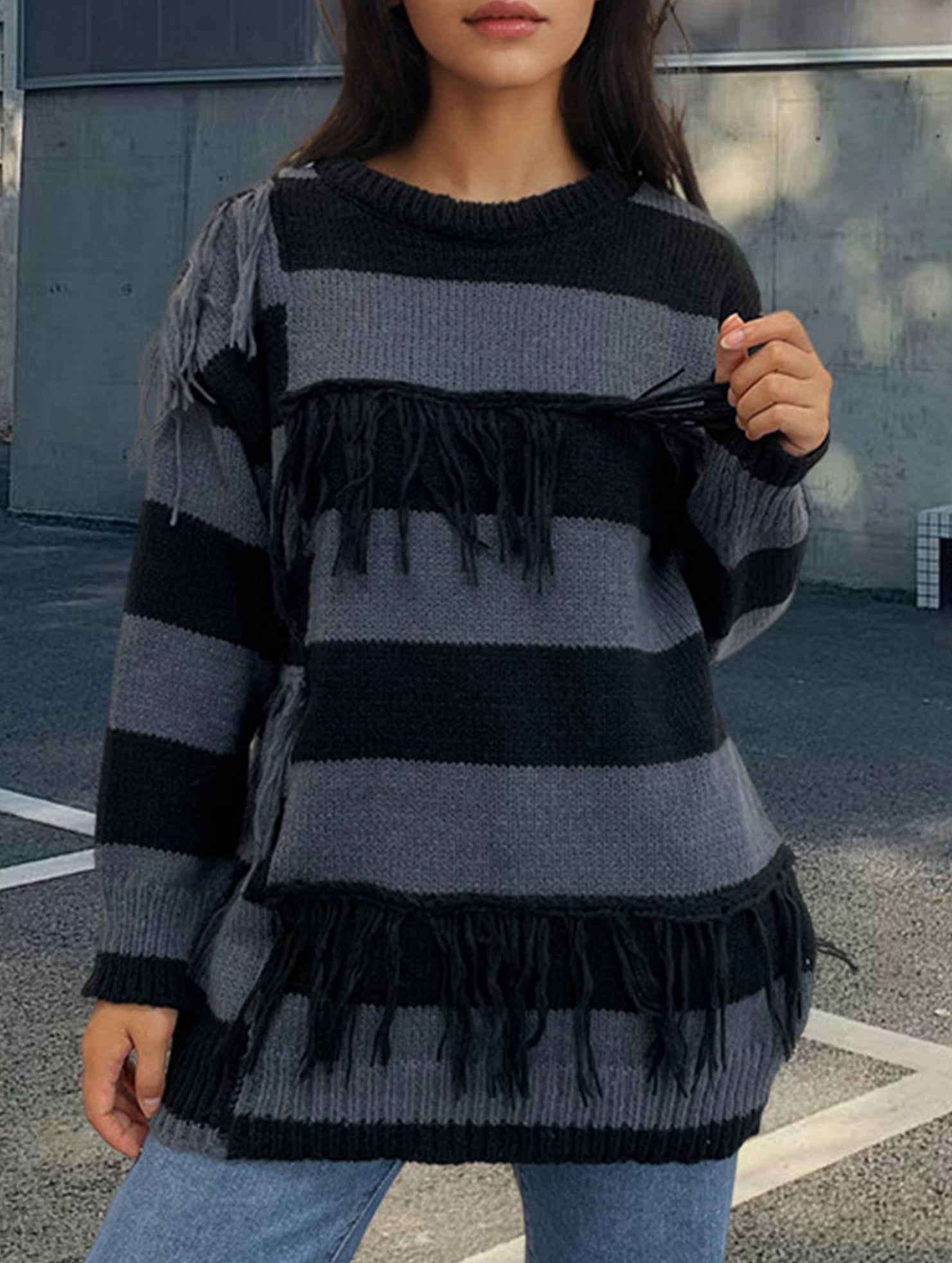 Color-blocked hand-knit tassel sweater
