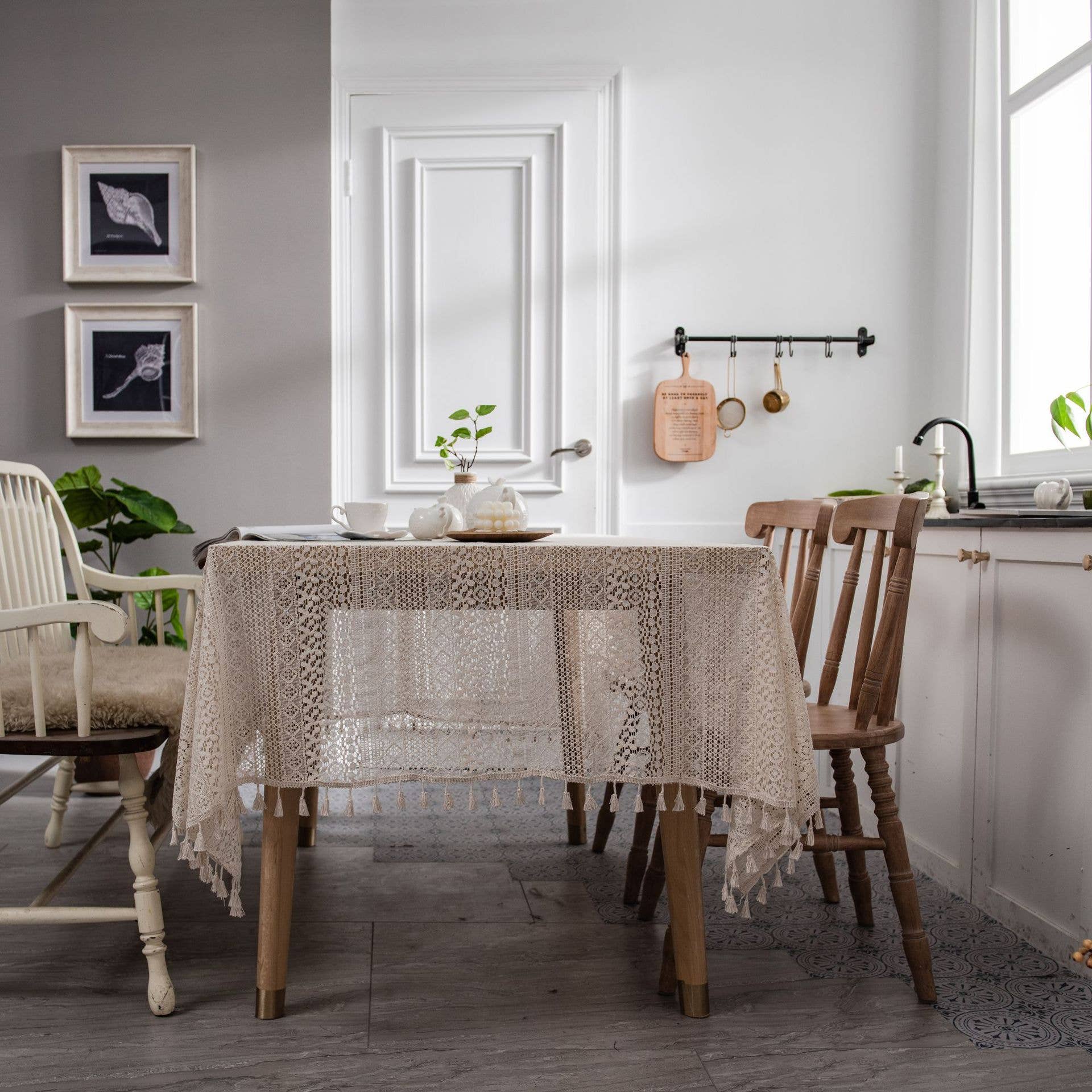 CROCHET HOLLOW TABLECLOTHS WITH TASSELS\nSIZE:100*150CM(1)\n 150*150CM(1)\n 150*160CM(1)\n 150*180CM(1)\n 150*200CM(1)\n 150*220CM(1)\n 150*250CM(1)\n 150*300CM(1)\n100% COTTON\nMADE IN CHINA