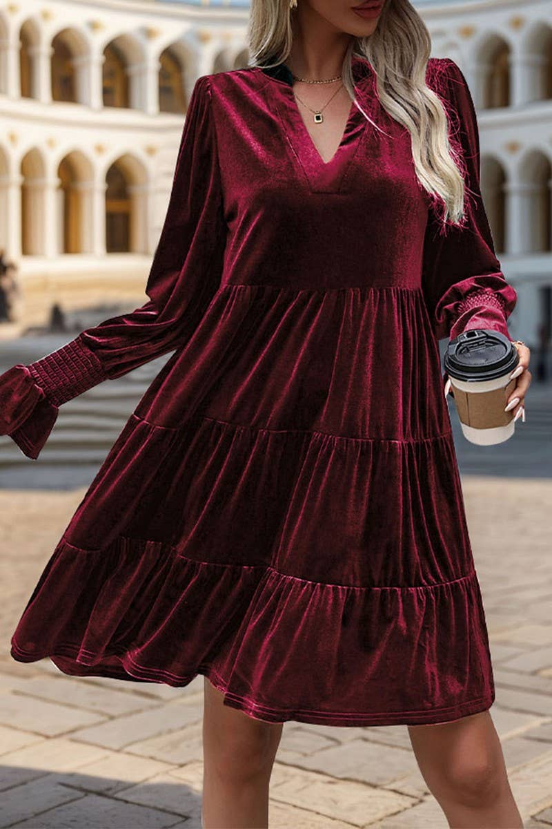 V-NECK LONG-SLEEVED SOLID COLOR VELVET DRESS