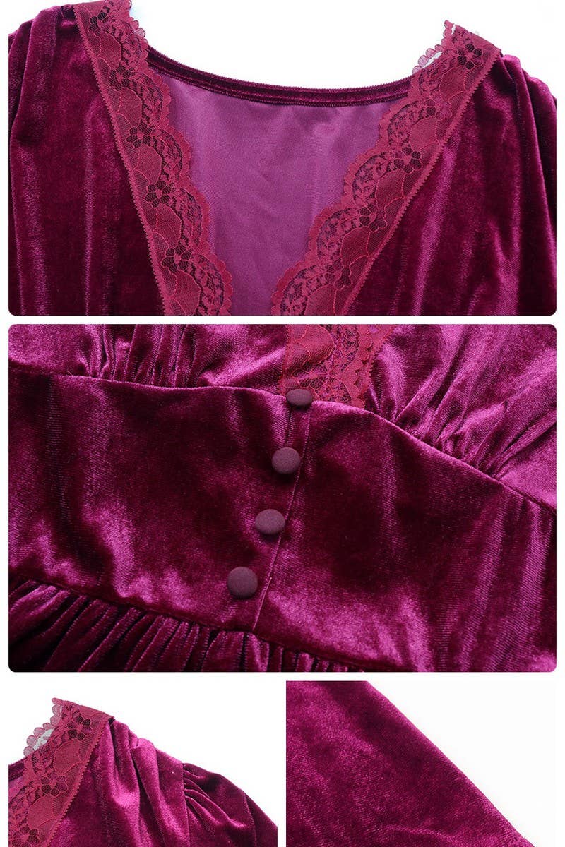 V-NECK SOLID COLOR GOLD VELVET LONG-SLEEVED DRESS