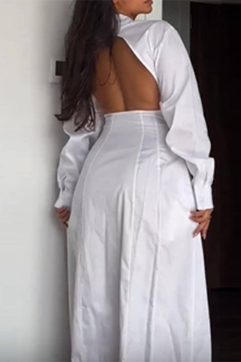 BACKLESS WAISTED SOLID COLOR LONG SLEEVE DRESS