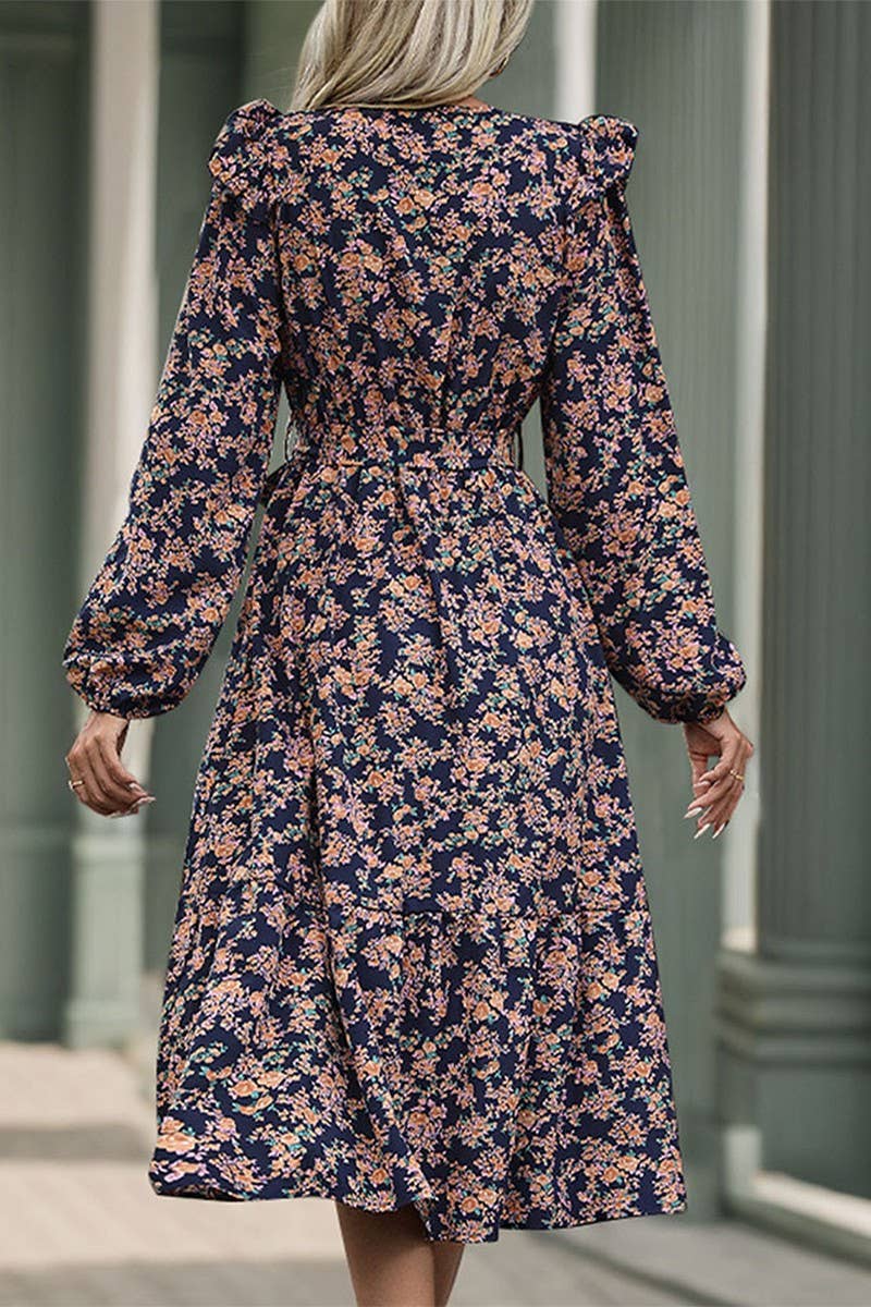 AUTUMN RUFFLE LONG SLEEVE PRINTED V-NECK DRESS