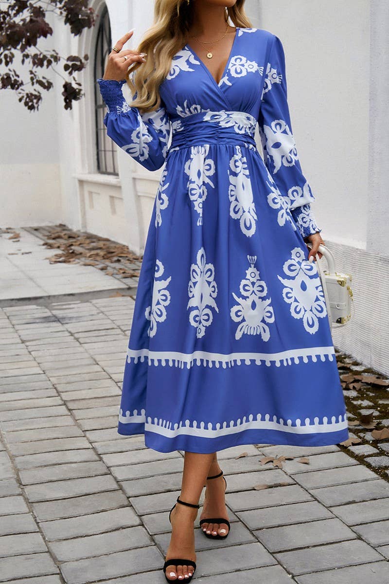 V-NECK ELEGANT CONTRAST COLOR LONG SLEEVE DRESS