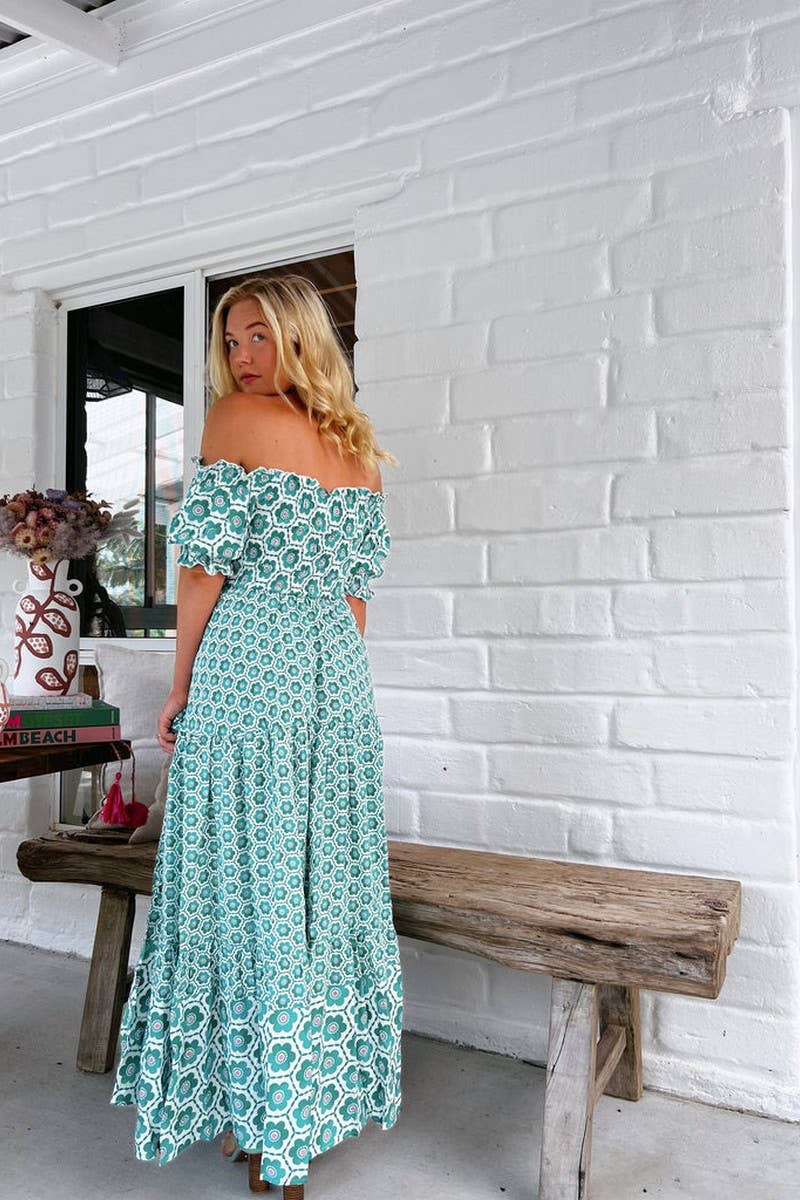 FLORAL PUFF SLEEVE OFF-SHOULDER FLARED DRESS