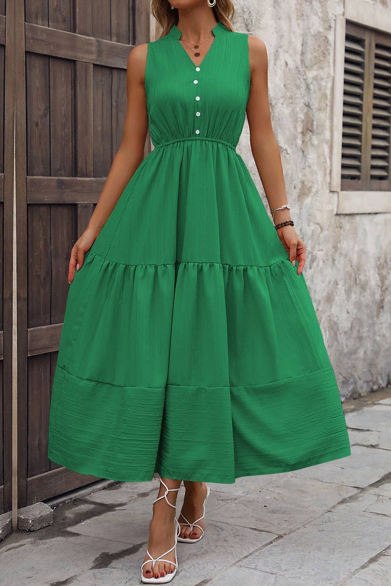 V-NECK SOLID SLEEVELESS STAND COLLAR A-LINE DRESS