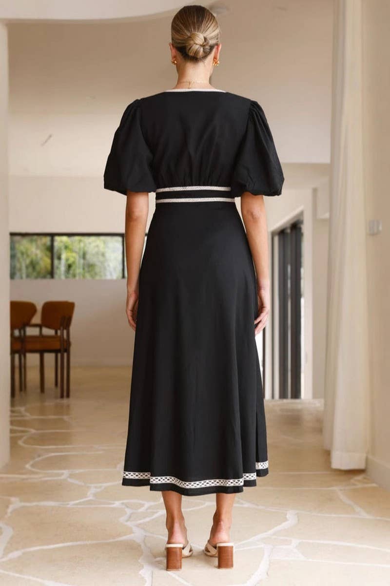 V-NECK SOLID LACE PUFF SLEEVE WAIST MAXI DRESS
