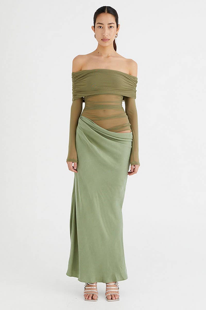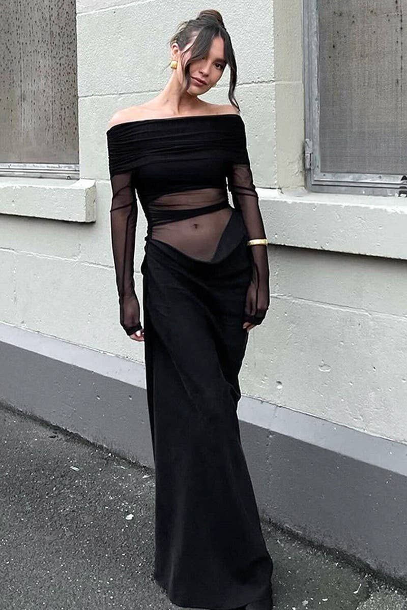 OFF SHOULDER LONG SLEEVE CUTOUT PATCHWORK DRESS