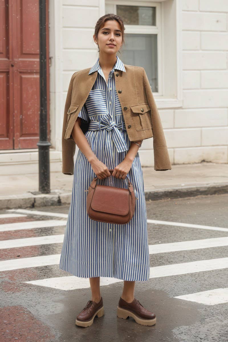 STRIPED BELTED CINCHED WAIST SHORT SLEEVE DRESS