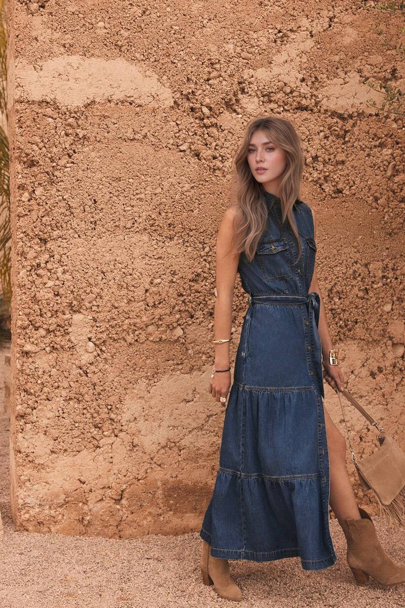 SLEEVELESS DENIM SINGLE BREASTED LONG DRESS