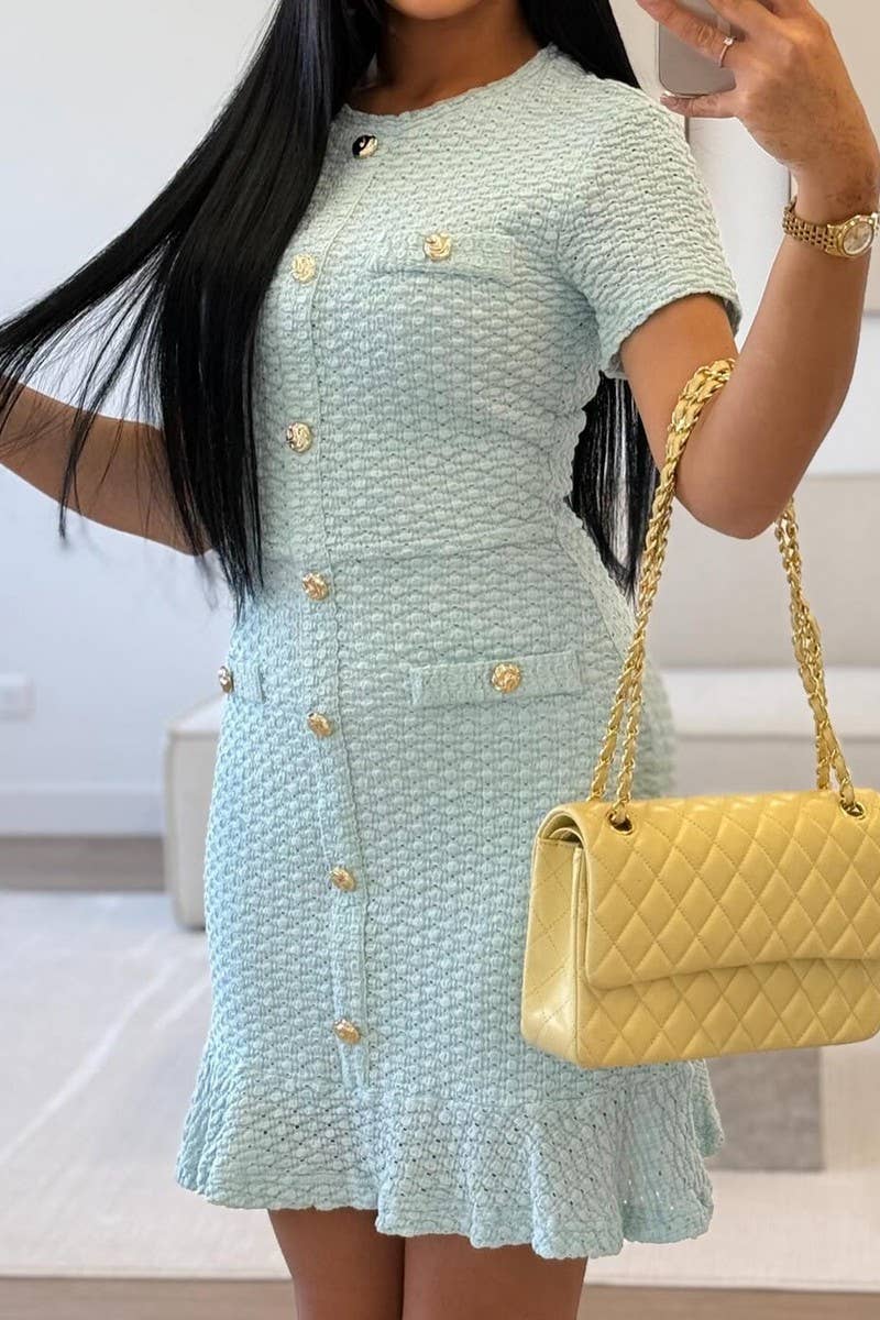 SOLID BUTTON FRONT SLIM FIT SHORT SLEEVE DRESS