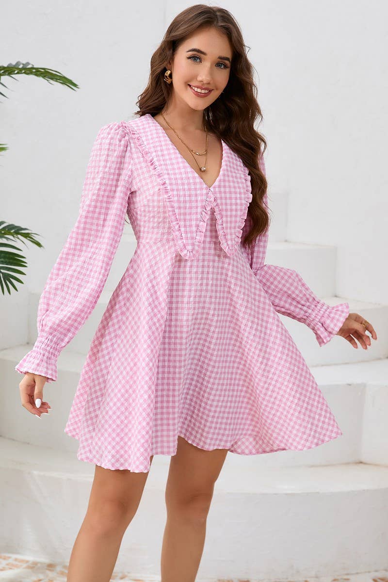LARGE LAPEL WIDE HEM LONG SLEEVE PLAID DRESS