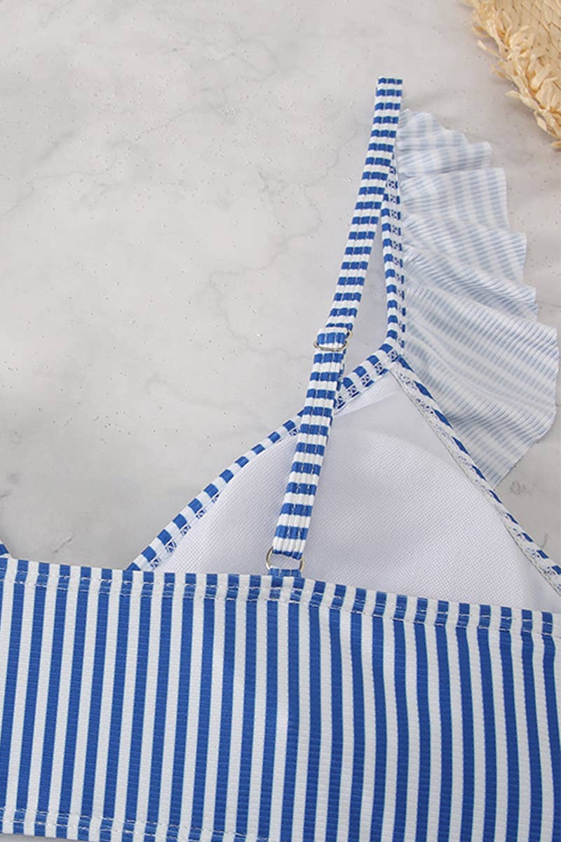 STRIPED HIGH WAISTED V-NECK RUFFLED SWIMSUIT