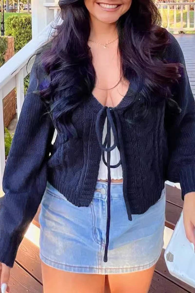 SOLID V NECK CABLE KNIT TIE FRONT CARDIGAN