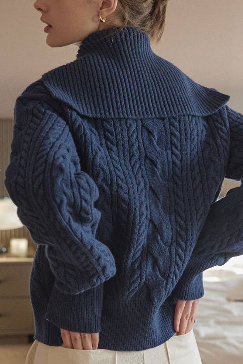 NAVY COLLAR LONG SLEEVE TWIST BUTTON CARDIGAN