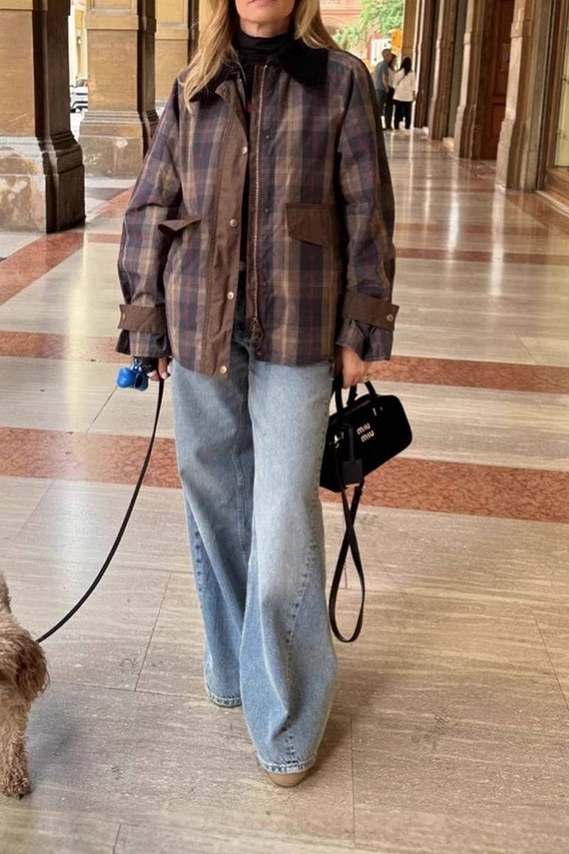 VINTAGE PLAID FUR COLLAR QUILTED ZIP-UP JACKET