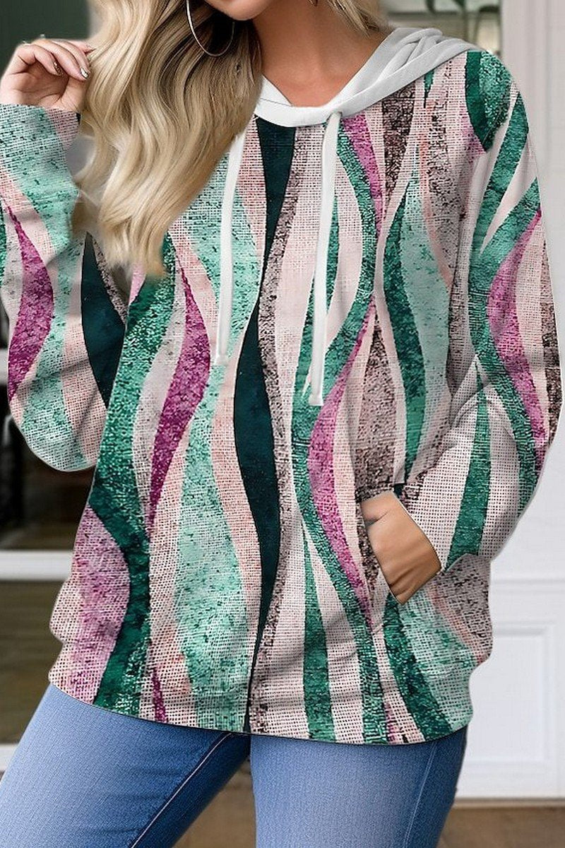 WOMEN DRAWSTRING HOODED 3D PRINTING PULLOVER TOP