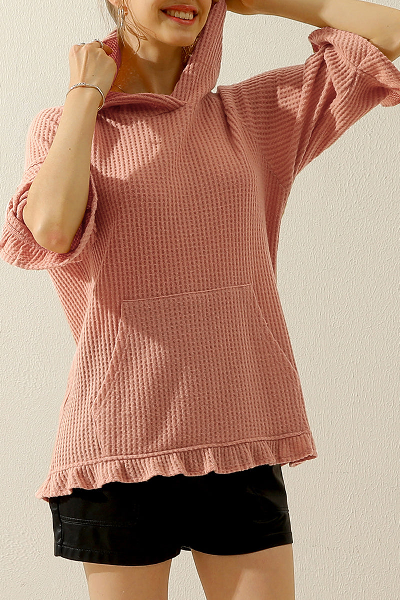 HOODED 3/4 RUFFLED SLEEVE KNIT SWEATER WITH POCKET