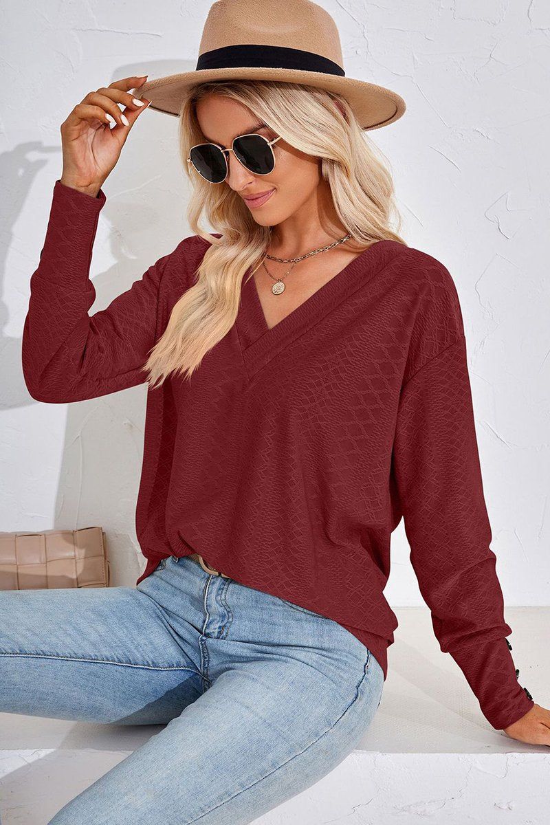 WOMEN V NECK BUTTONED CUFF LOOSE FIT BLOUSE