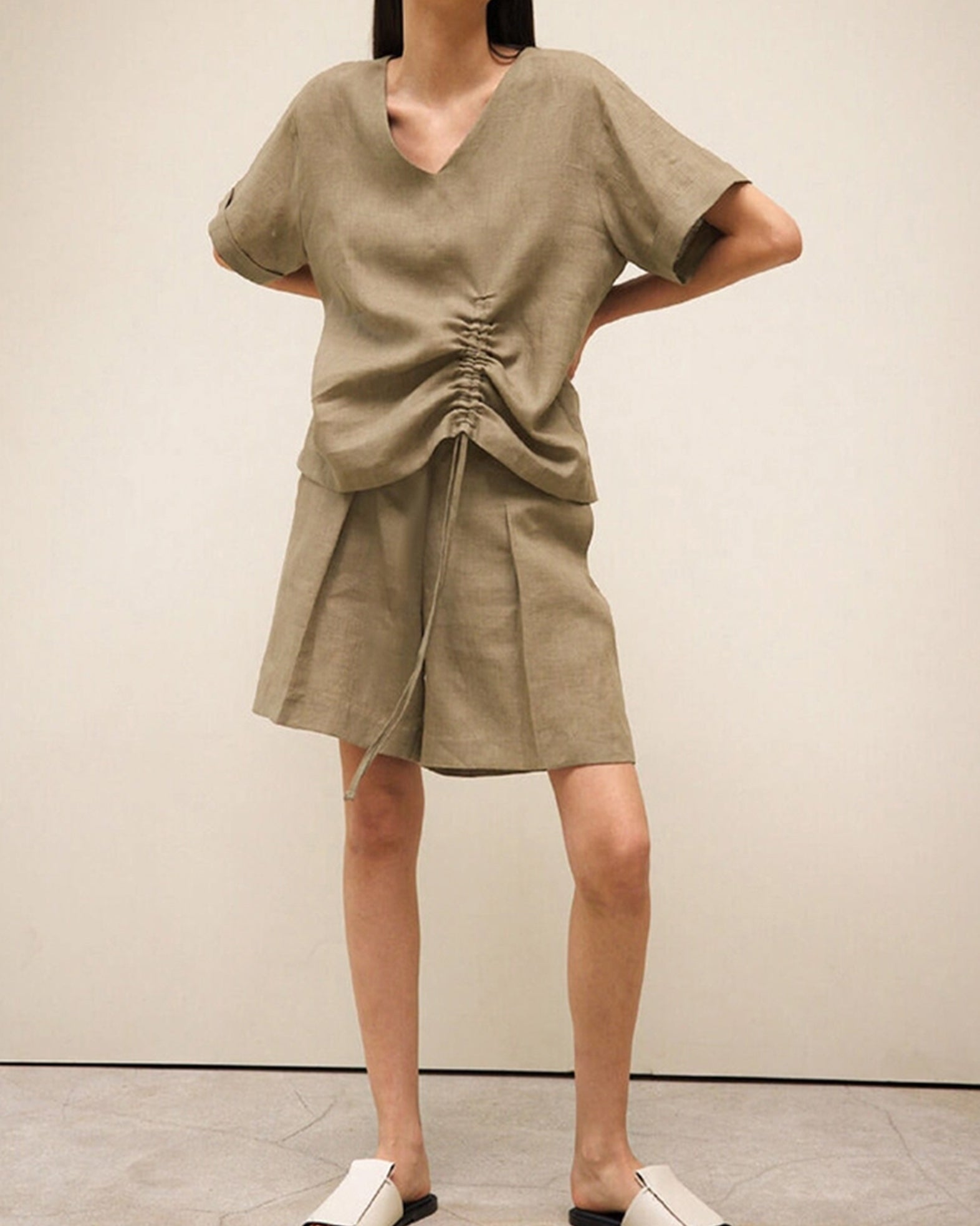Linen V-Neck Slouchy Commuter Blouse ??Effortless Elegance for Everyday