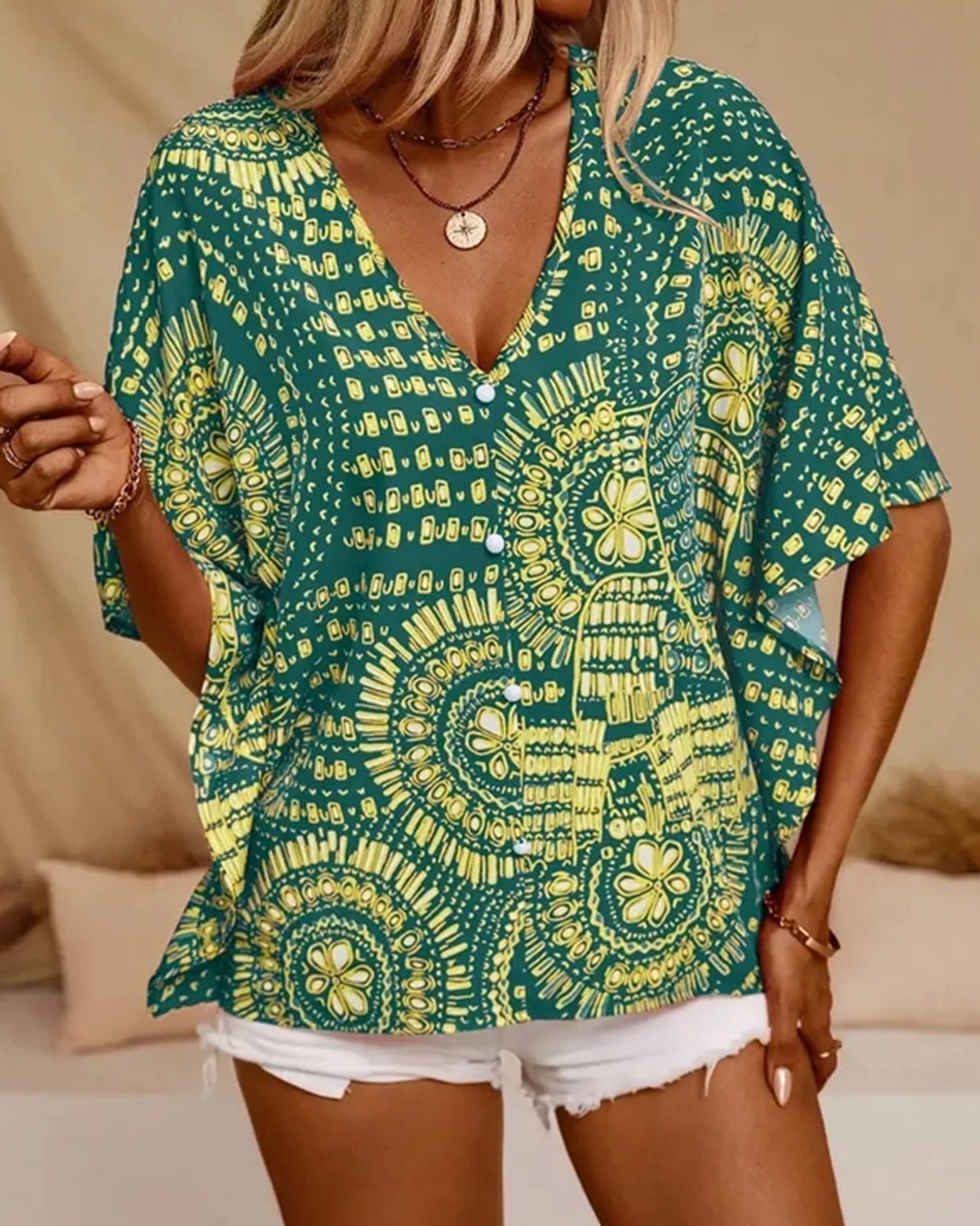 Experience effortless elegance with our V-Neck Printed Resort-Style Bat-Sleeved Top, designed to bring a breezy, relaxed vibe to your warm-weather wardrobe. Crafted from a comfortable blend of polyester and spandex, this top features flowing bat sleeves and a flattering V-neckline, perfect for vacation days or casual outings. Its vibrant print and lightweight fabric ensure you stay stylish and cool all day long.