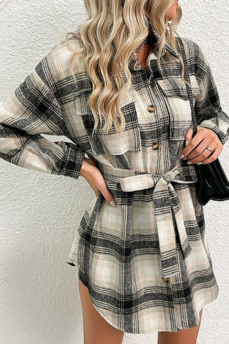WOMEN LONG LENGTH PLAID PATTERN BELTED SHACKET