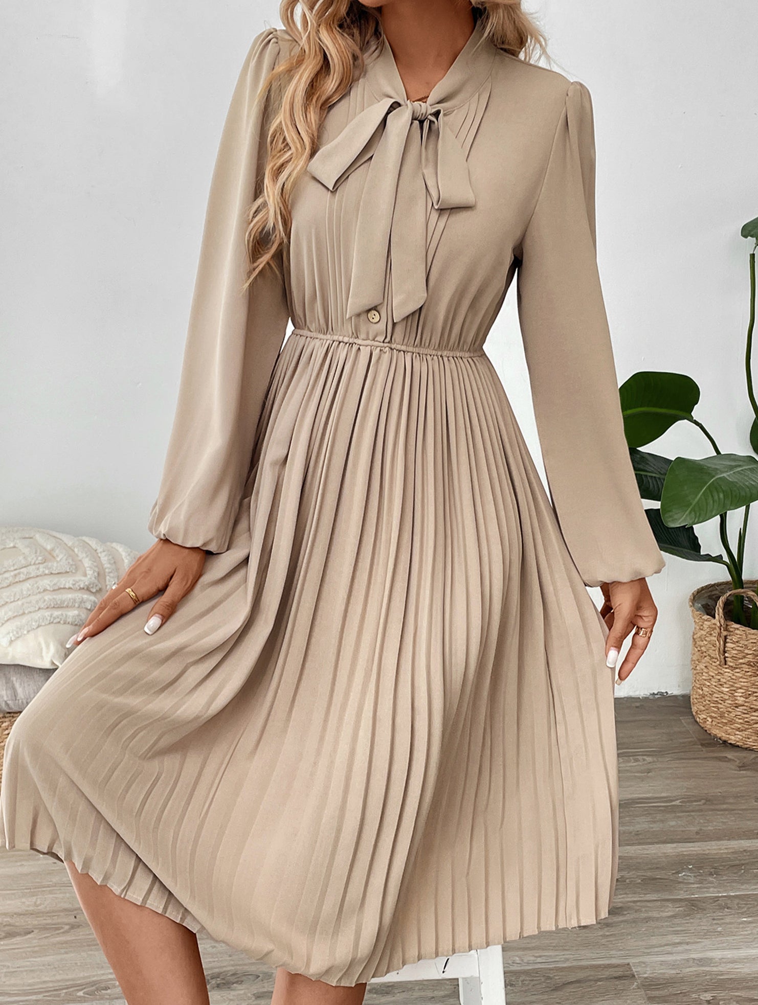 Elegant pleated dress with bow tie collar