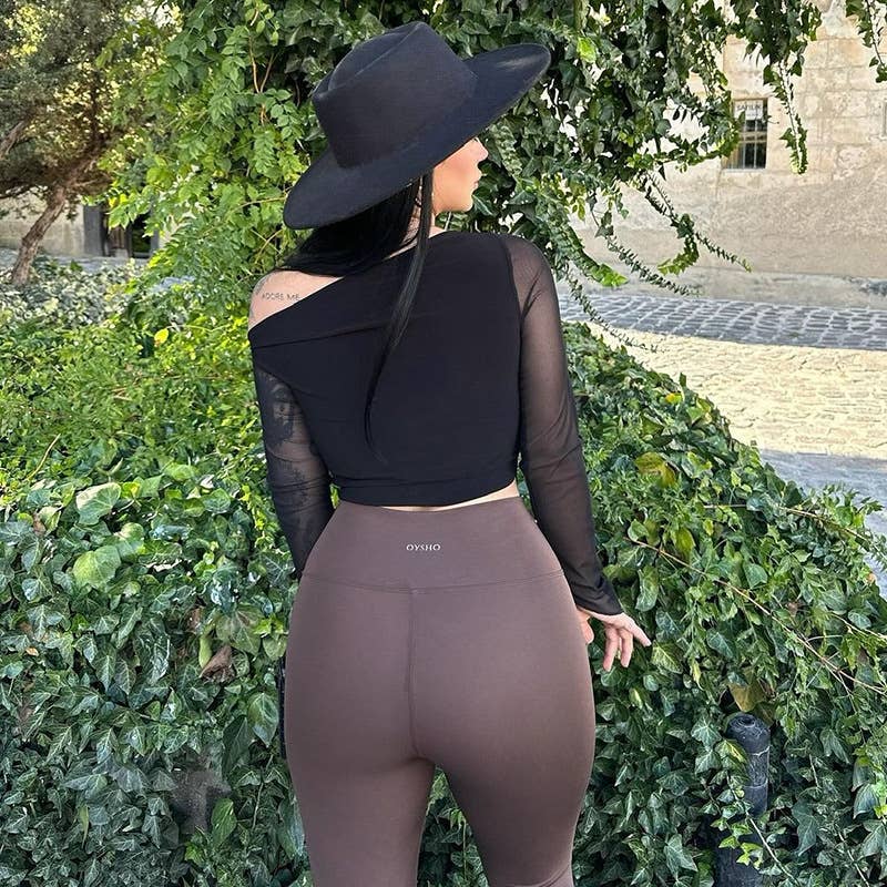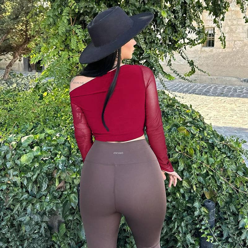 Elegant slim slant shoulder mesh sleeve top