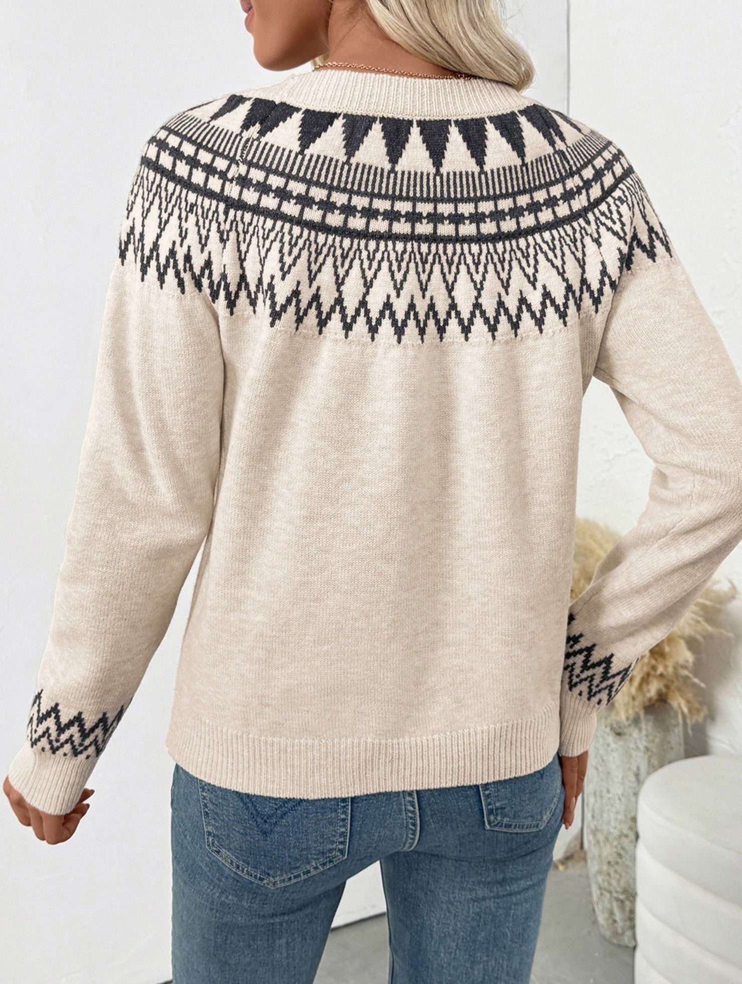 Ethnic style round neck pullover sweater