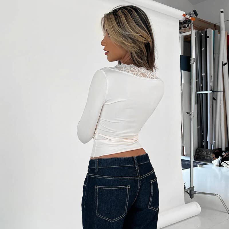 Fashionable Casual V-Neck Lace Trim Button-Up Top