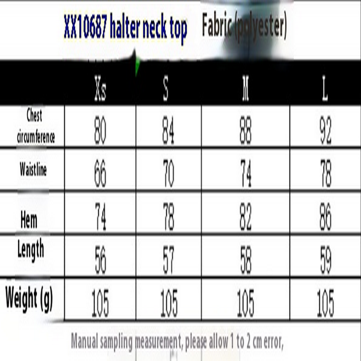 '- Material: Polyester\n- Size: XS, S, M, L\n- Weight: 105g