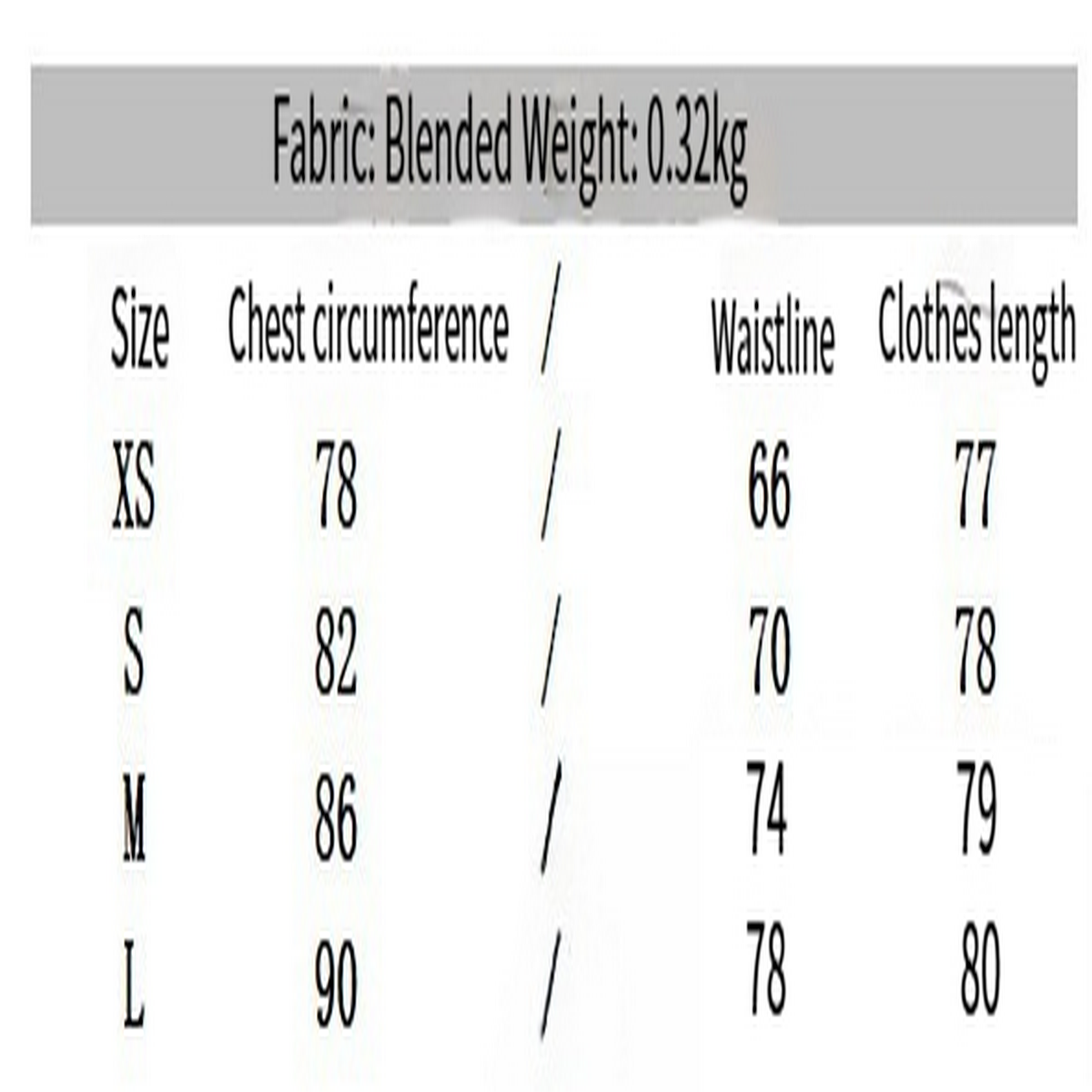 '- Material: Polyester (polyester fiber)\n- Size: XS, S, M, L\n- Weight: 320g