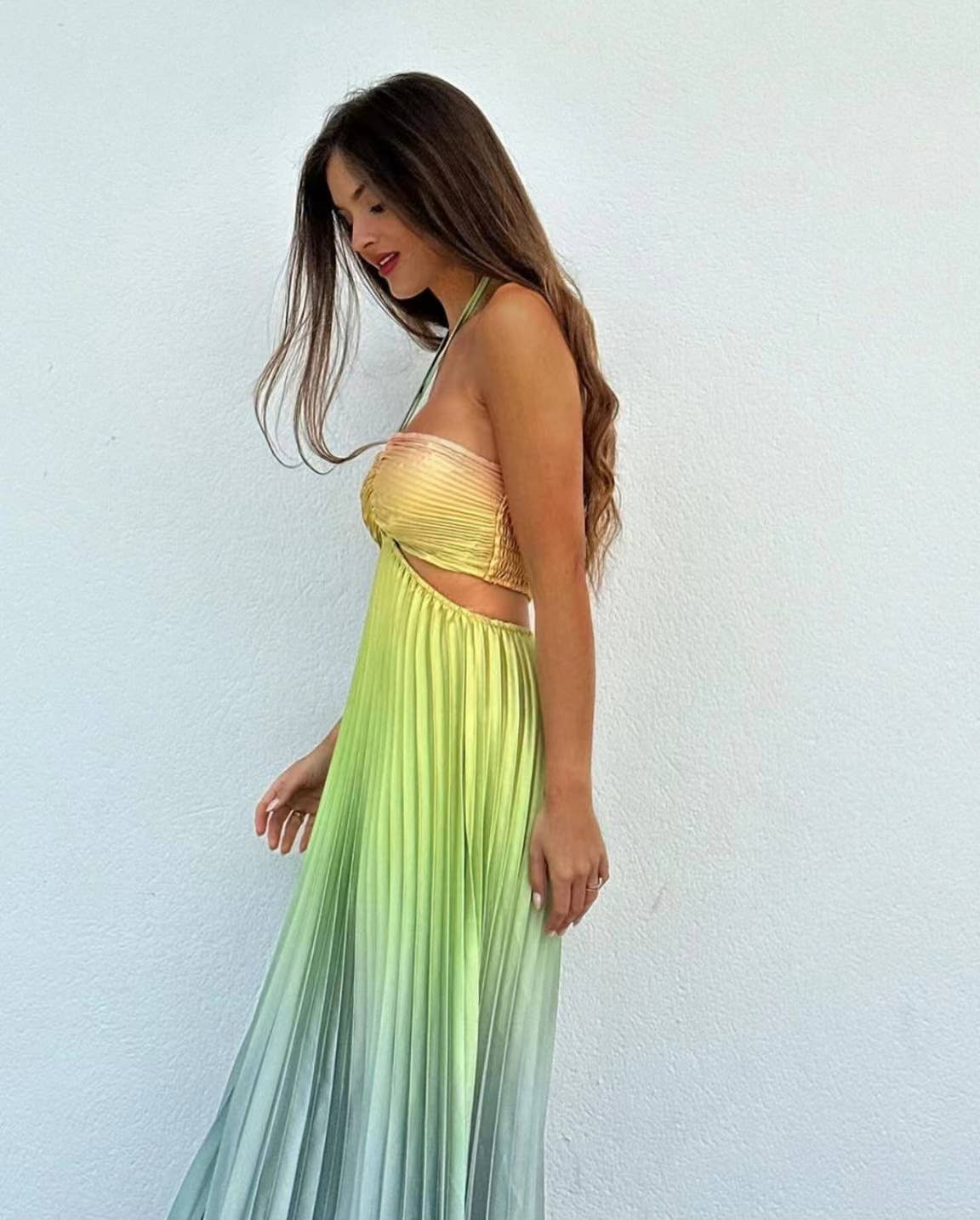 With a clean silhouette and easy wearability, the Gradient Halter Pleated Beach Vacation Dress fits seamlessly into your rotation.
