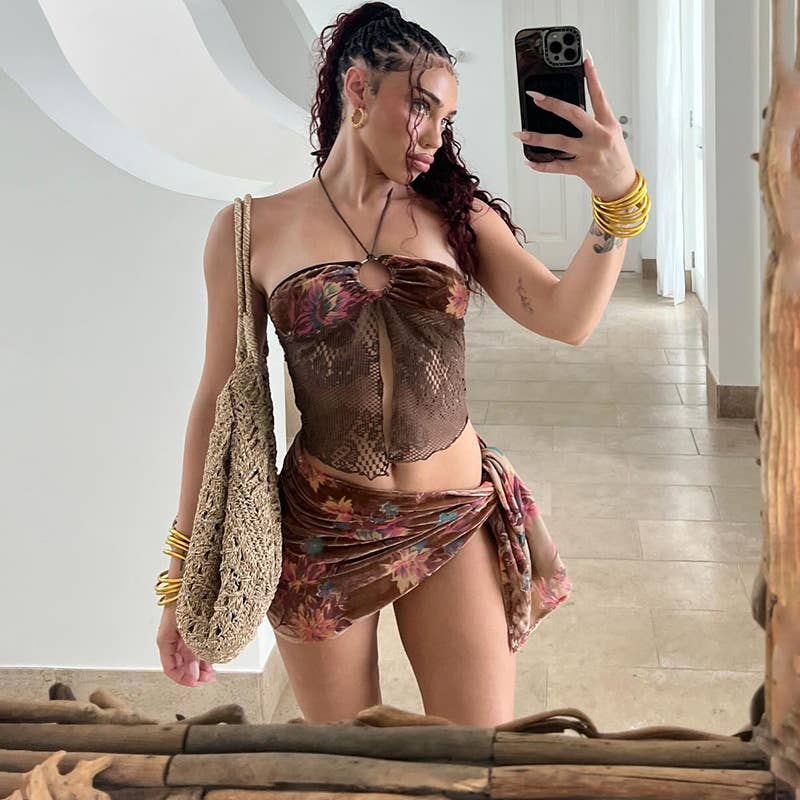 Halter Neck Crop Top Bikini 3 Piece Set