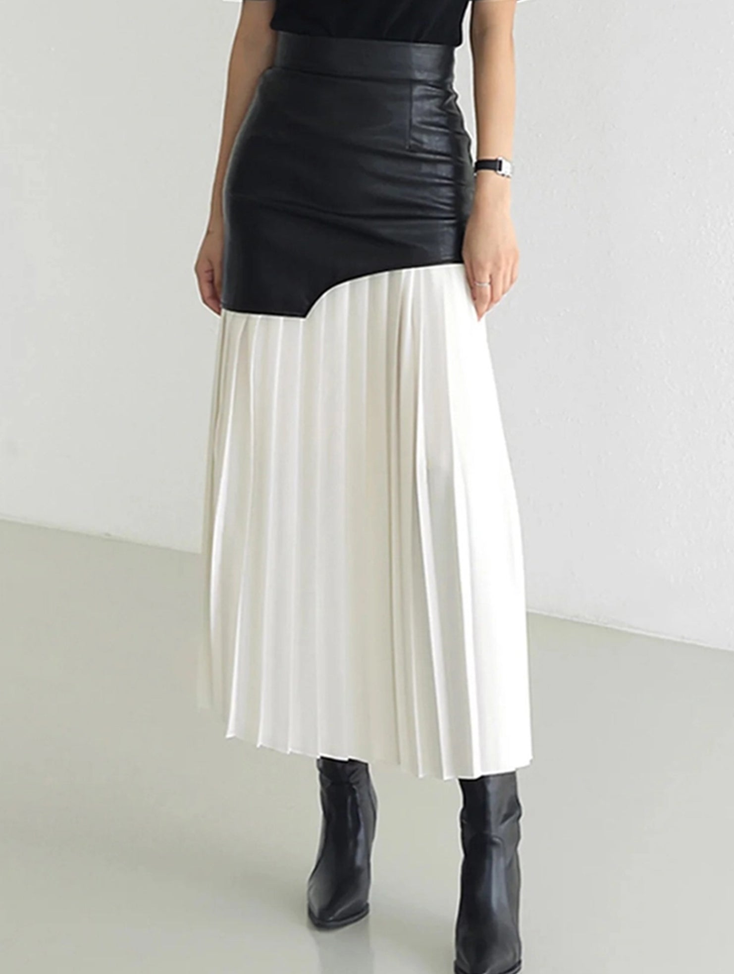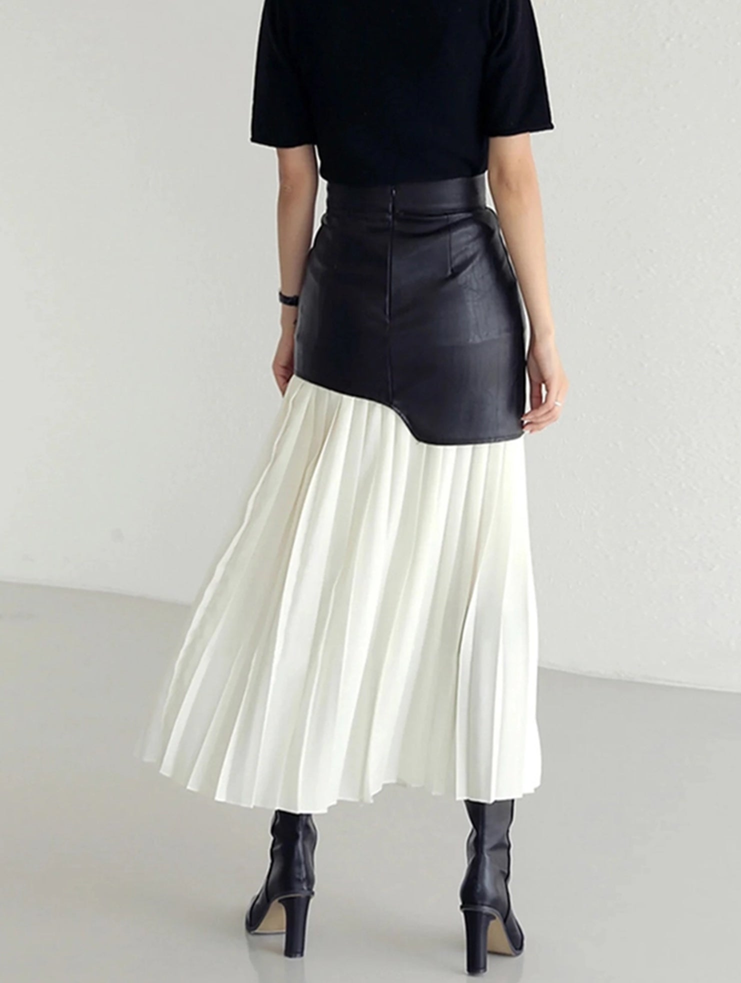 This patchwork leather skirt has a flattering high-waist fit and soft stretch fabric. It has a shiny black leather look at the top and a soft white pleated fabric at the bottom. The waistband sits high on your waist to give you a nice shape.