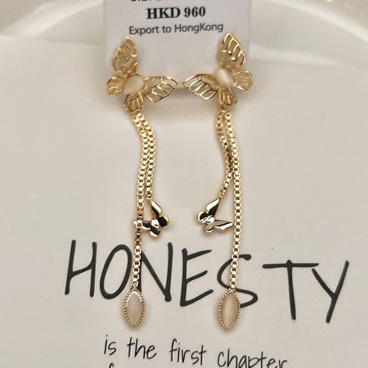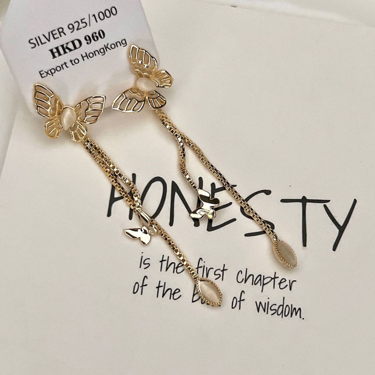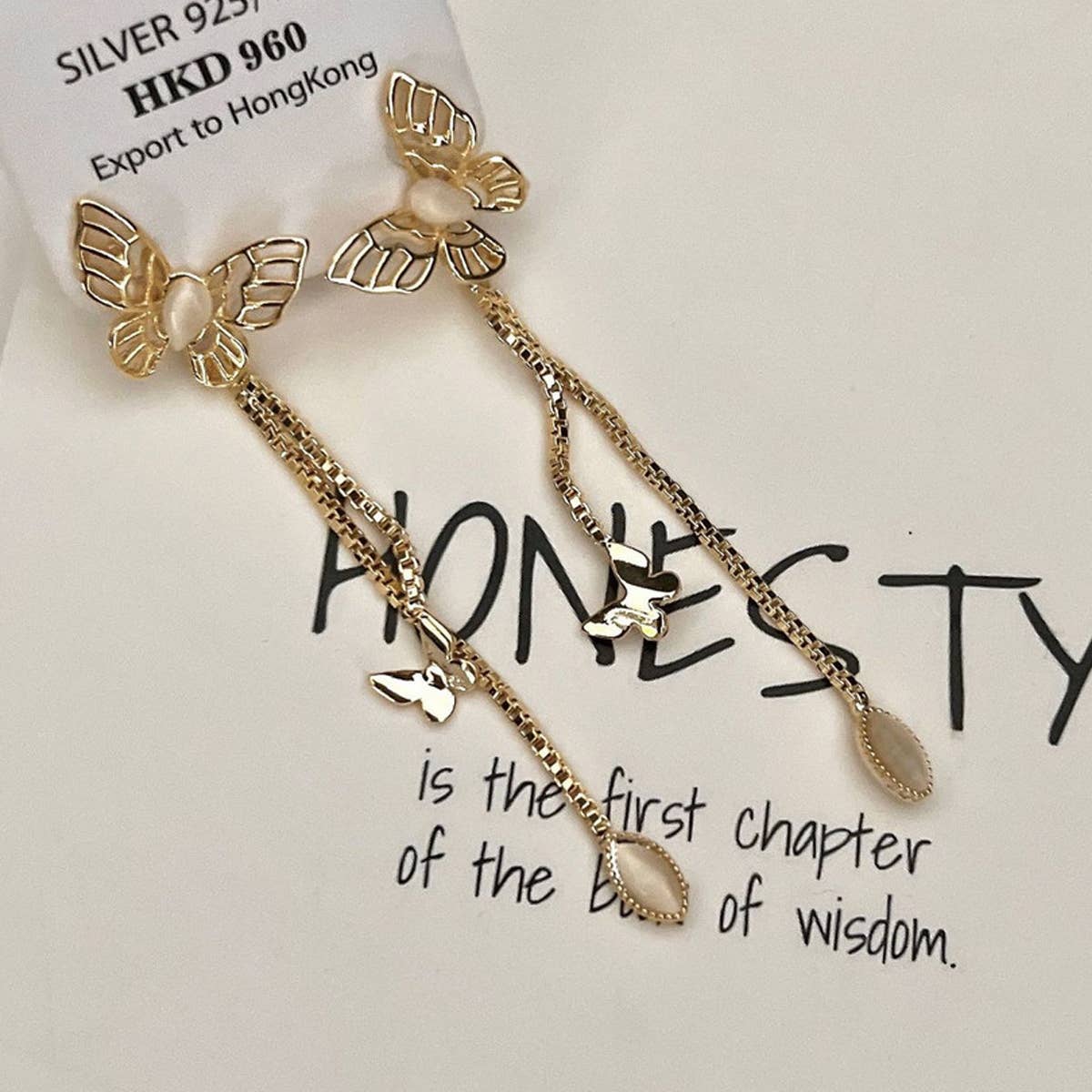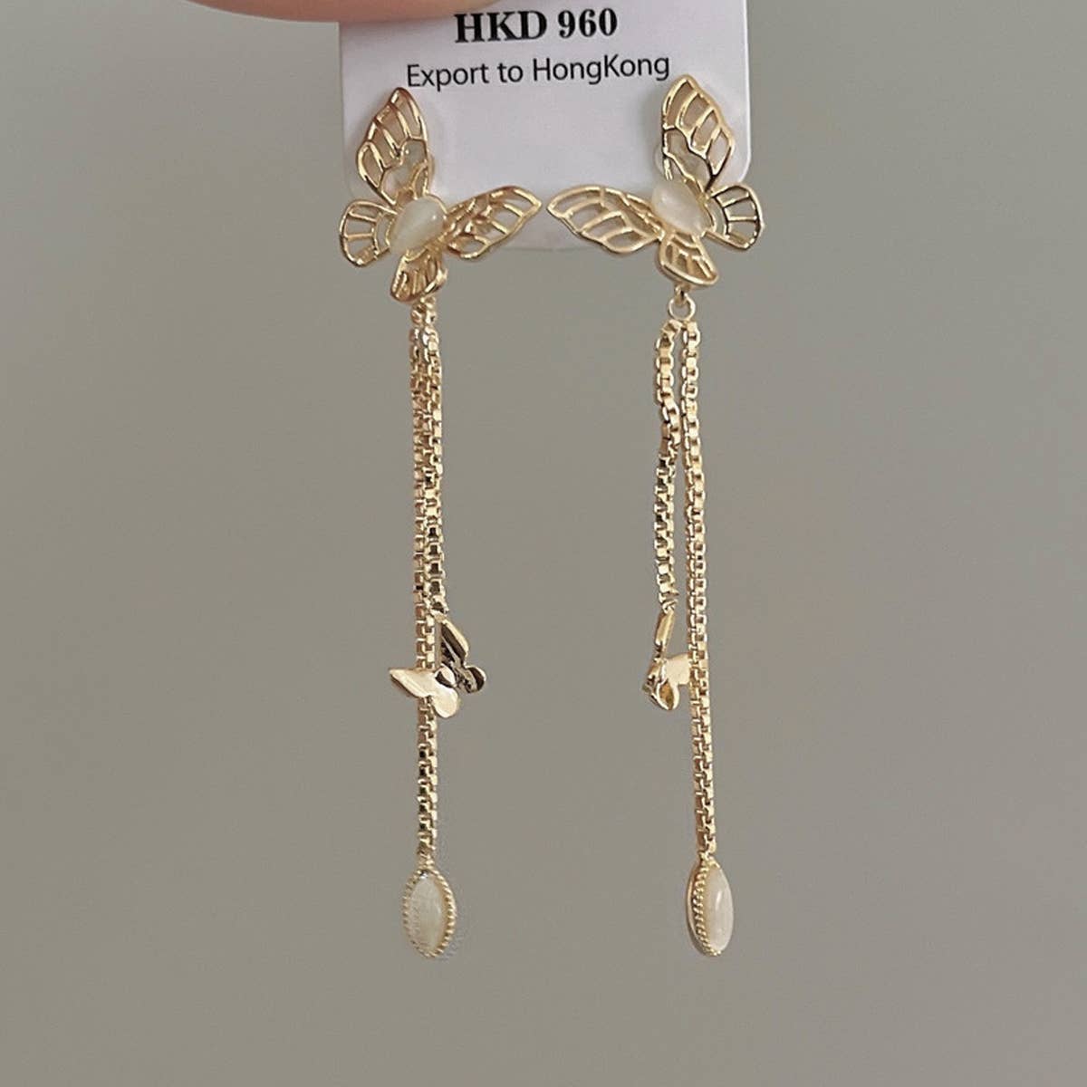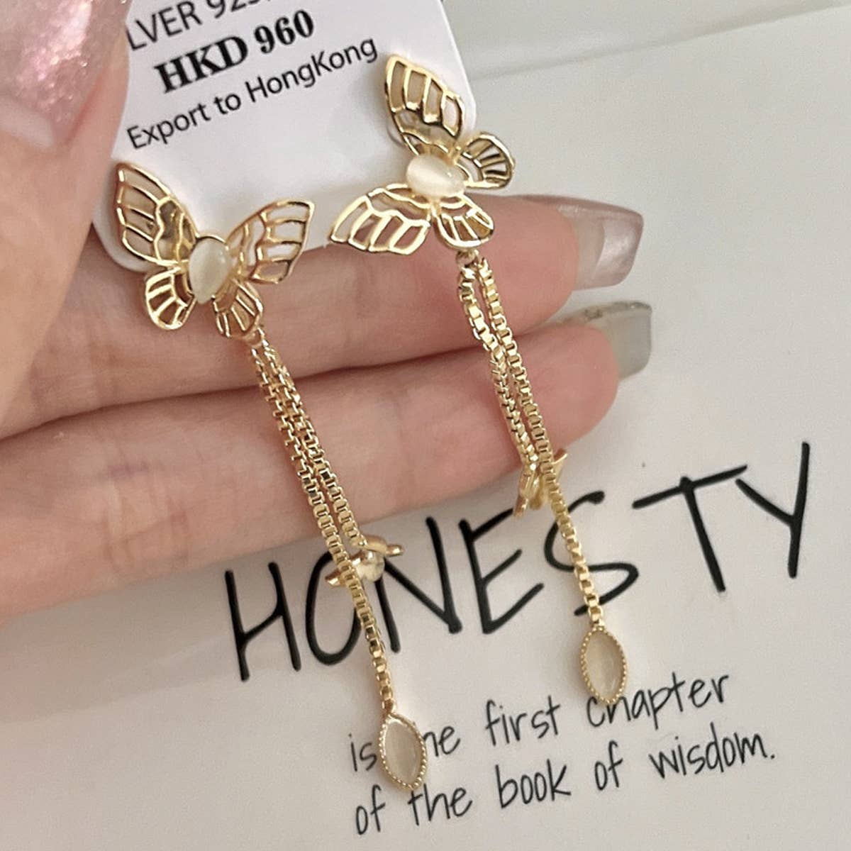 HOLLOW CAT'S EYE BUTTERFLY PENDANT STUD EARRINGS\nSIZE:OS(2)\nMATERIAL: COPPER + ZIRCON\nMADE IN CHINA \n\nEARRINGS FOR WOMEN BULK,EARRINGS FOR WOMEN GOLD,EARRINGS FOR WOMEN BOHO,EARRINGS FOR WOMEN PEARL,EARRINGS FOR WOMEN STUDS,EARRINGS FOR WOMEN BEADED,EARRINGS FOR WOMEN WITH DISPLAY,EARRINGS FOR WOMEN STERLING SILVER,EARRINGS FOR WOMEN HOOPS,SPECIAL SHAPE, PENDANT, LETTERS, JEWELRY, SQUARE, ROUND, BEACH, BEACH SHELL NECKLACE, CUTE, GORGEOUS, FASHIONABLE, RETRO, 18K GOLD-PLATED NECKLACE, DIAMOND, BOHEMIAN, SMOOTHEST, POPULAR, WHOLESALE, 2024 NEW STYLE, BEST SELLING PENDANT NECKLACE BEST,QUADRANGLE, EARRINGS, CHAIN, HIGH-END, OPAL, CRYSTAL, FLOWERS, BOW, IRREGULAR, SIMPLE, HOLLOW, LIGHT LUXURY, GREEN, RING CLIP
