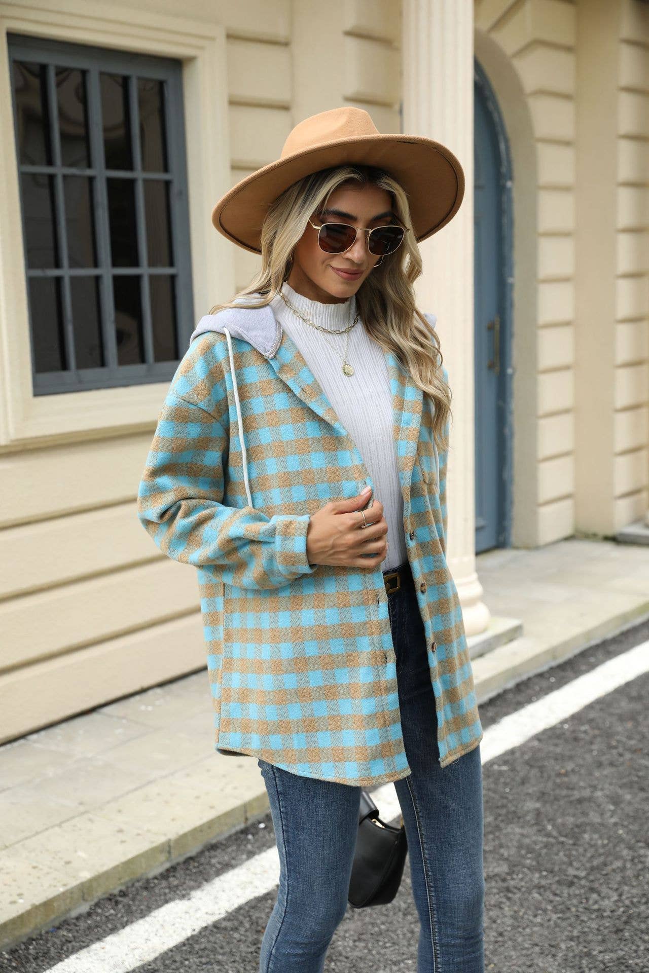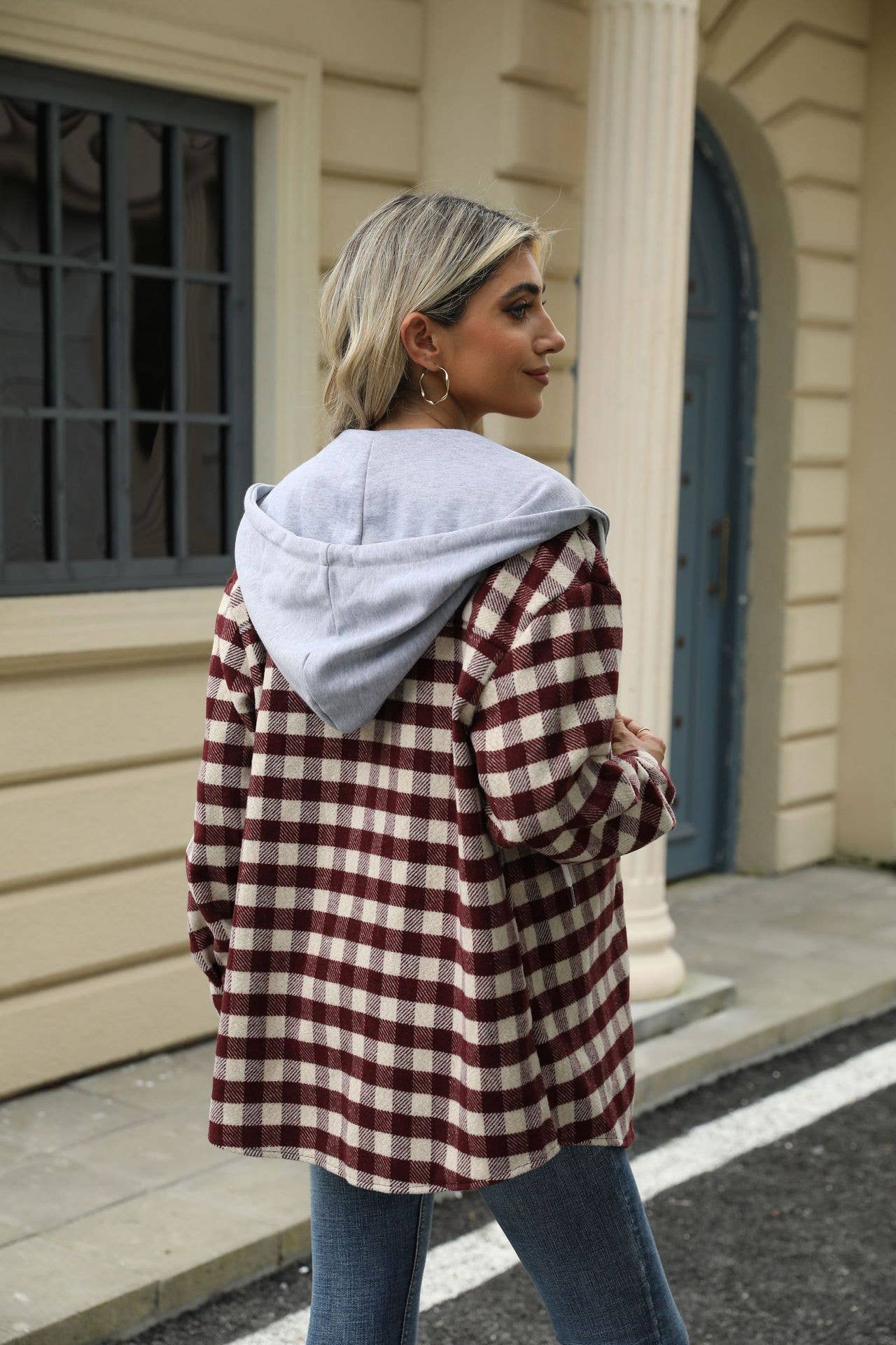 HOOD PLAID PATCHWORK SINGLE BREASTED WOOLEN COAT