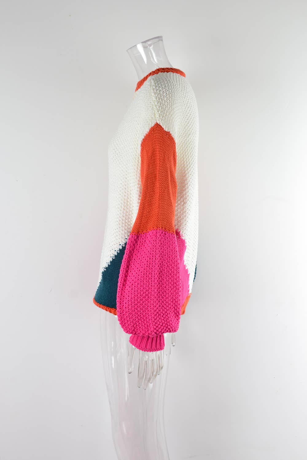 KNIT CREW NECK COLOR PATCHWORK PULLOVER SWEATER