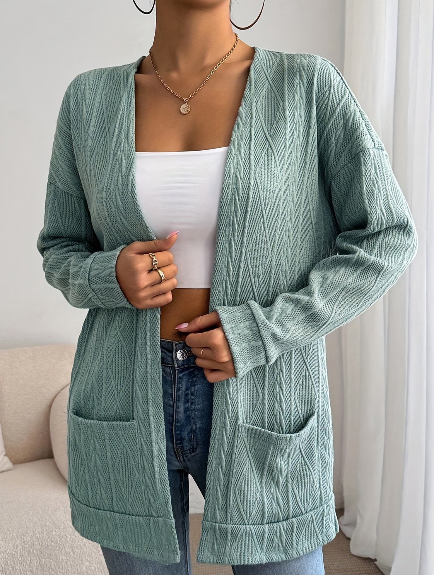 Knitted drop shoulder double pocket cardigan