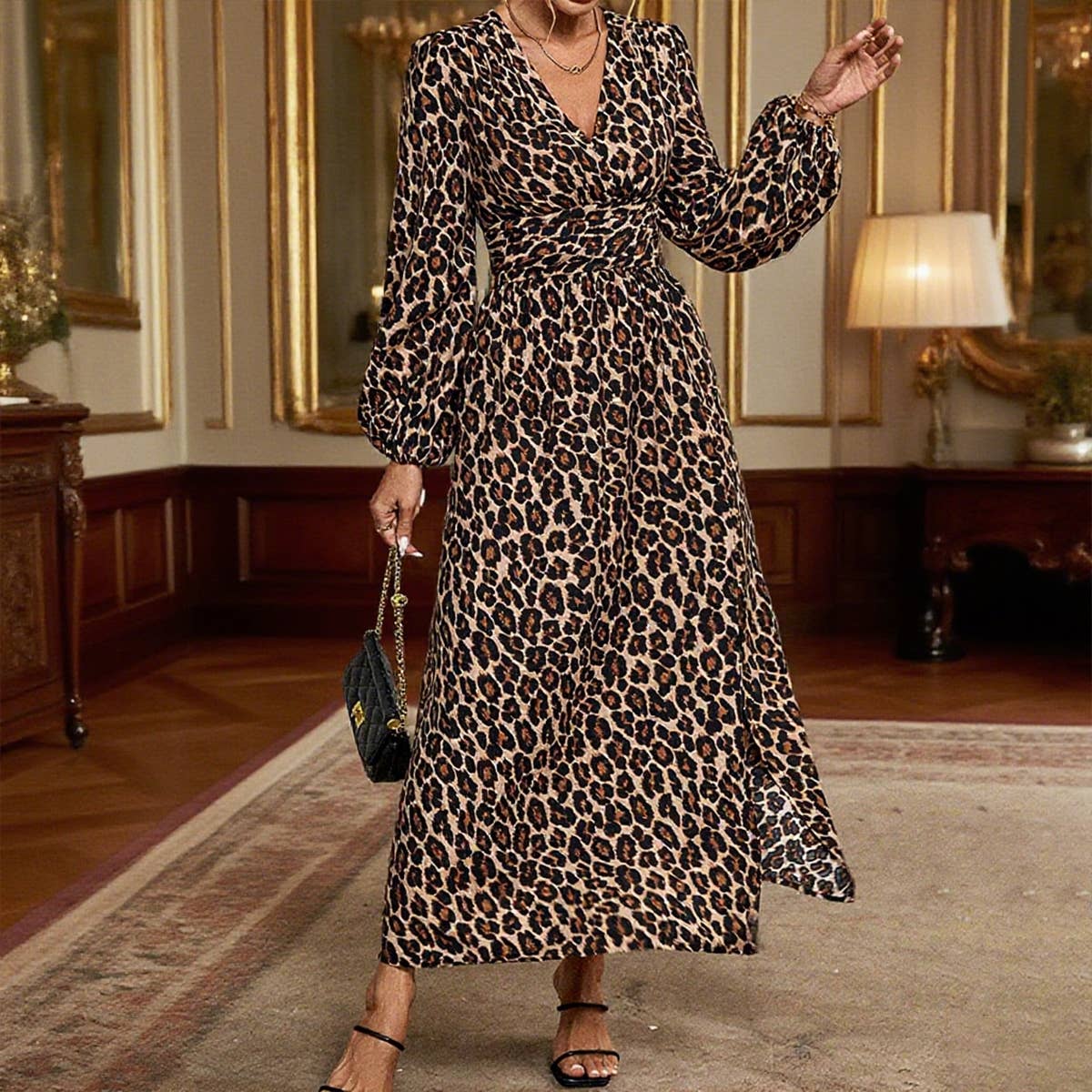 Lantern sleeve high slit V-neck dress