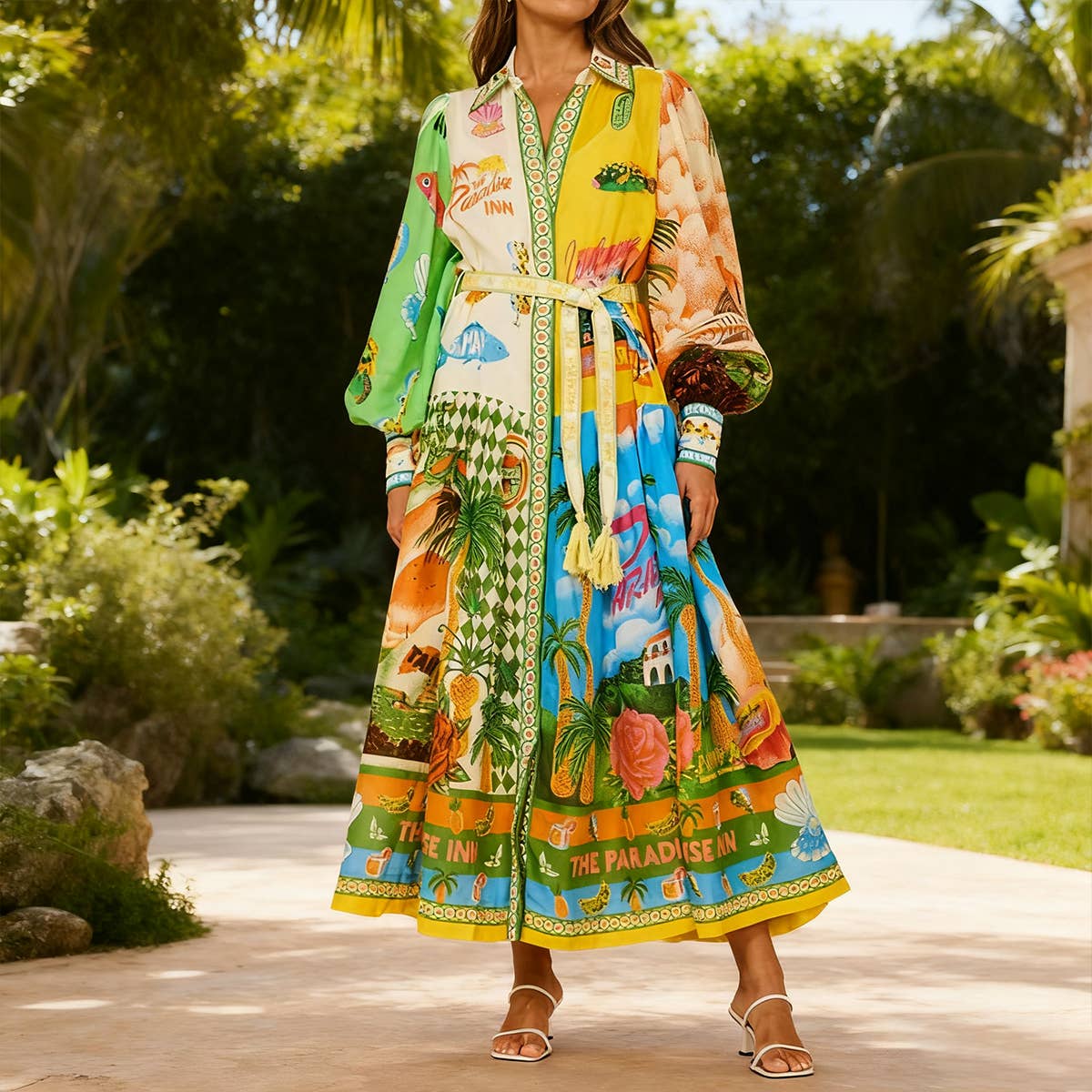 Lantern-sleeved graffiti printed lace-up dress