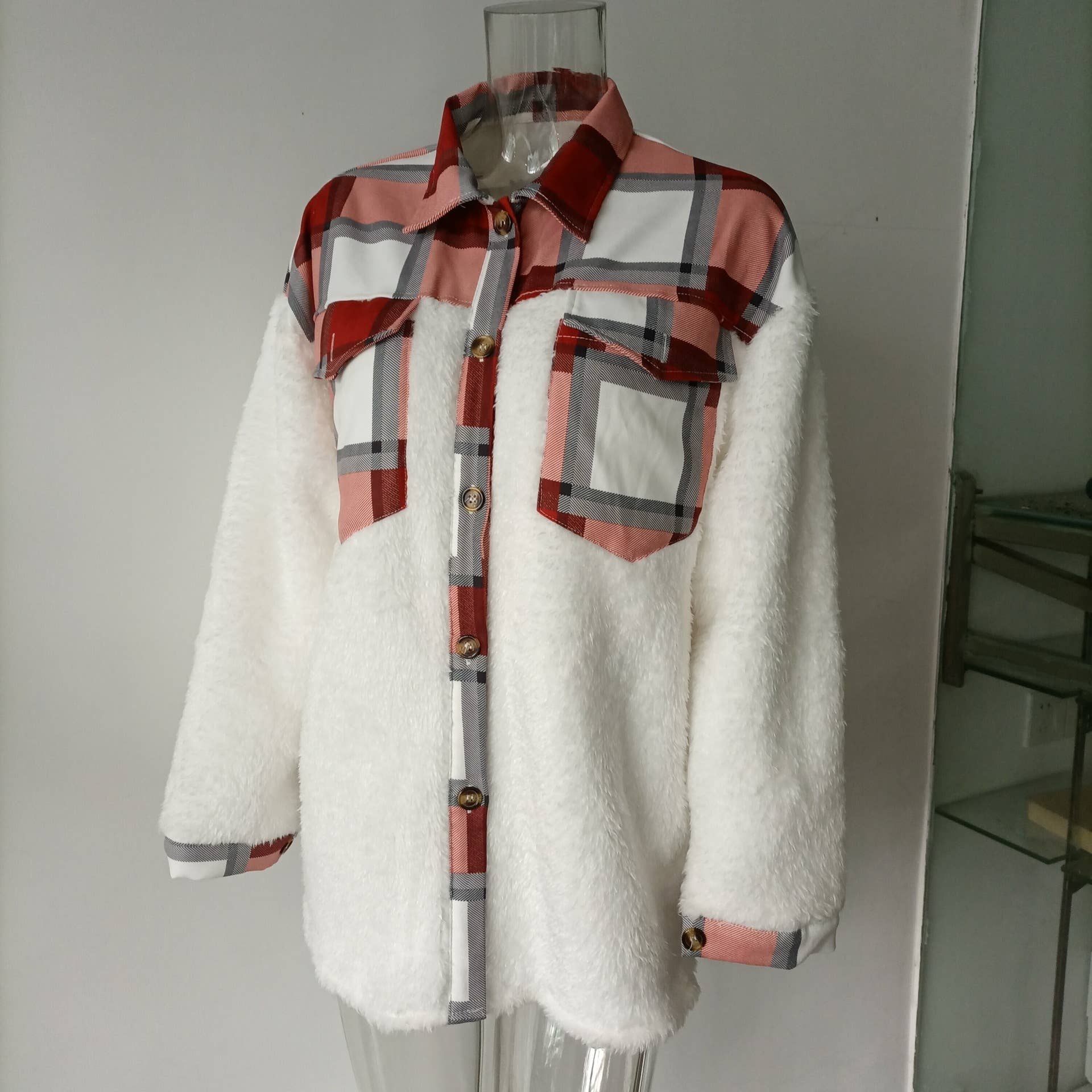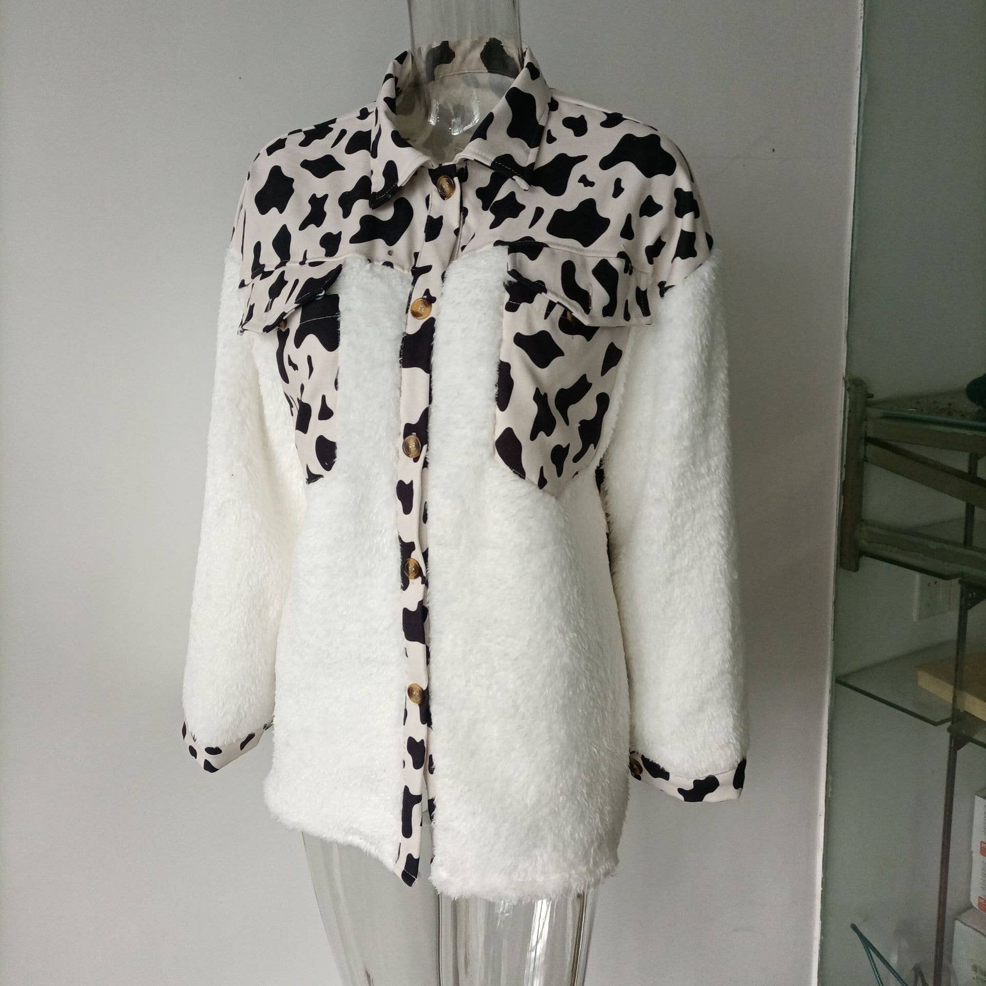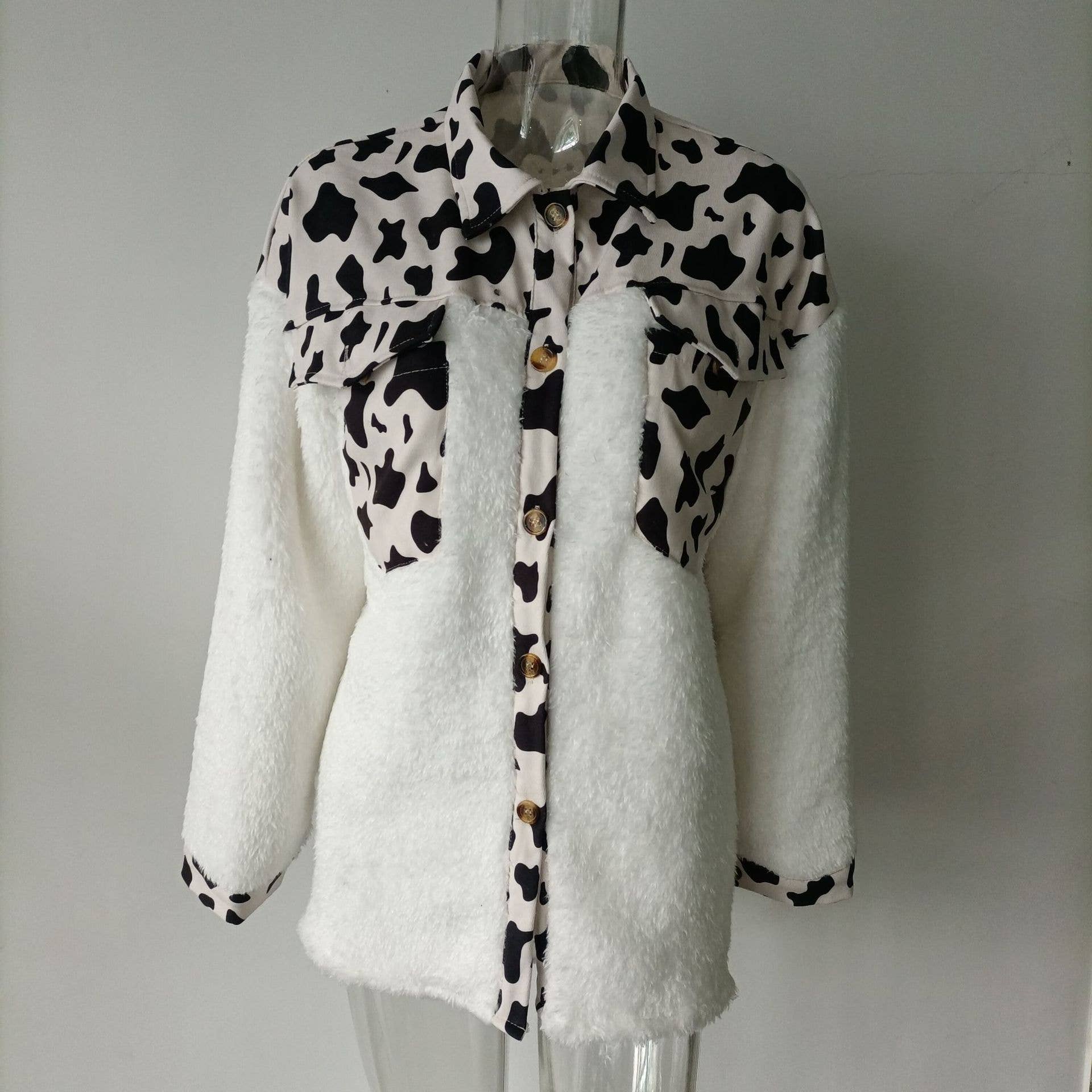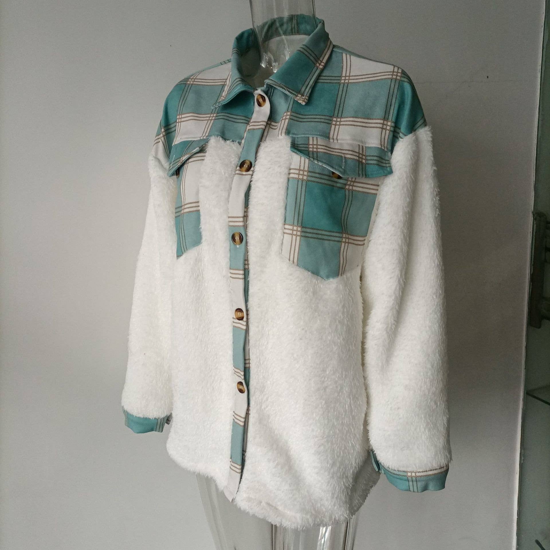 LAPEL LEOPARD PLAID PRINT FLEECE PATCHWORK COAT