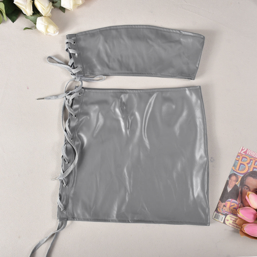 Leather Off Shoulder Tube Top Mini Skirt Suit