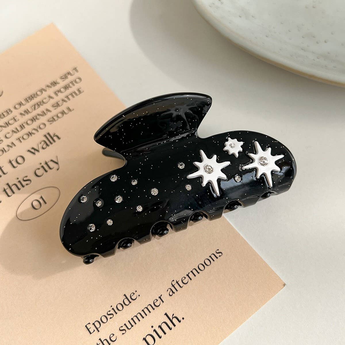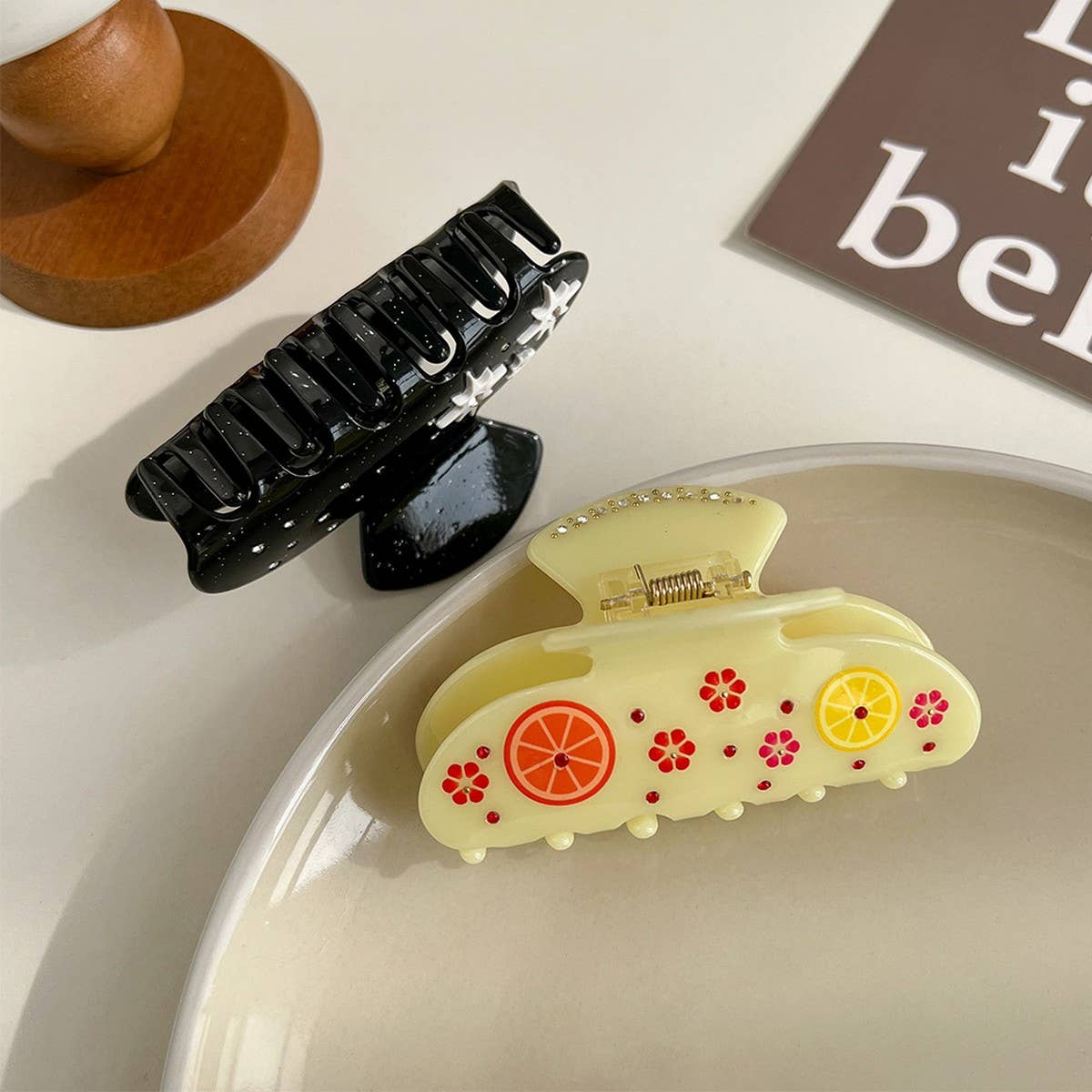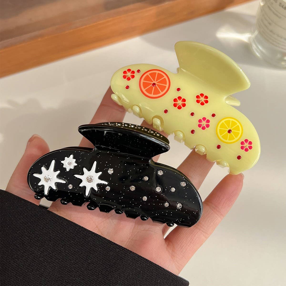 ? Size: 8 cm x 4 cm / 3.15 in x 1.57 in\n? Weight: Approx. 21.5 g\n? Material: Acetate\n? Design Elements: Lemon and black star motifs ?????\n? Style: Fresh and playful, perfect for adding a zesty and starry touch to your hairstyle\n\n#acetatehairclip #lemonclip #starclip #playfulaccessory #freshstyle #8cmclip\nTypes of products that will be on the shelves during this period:\nHair claw clip set, large hair claw clip, flower hair claw, boho claw clip, pearl hair claw, modern hair claw, rhinestone claw clip, colorful hair claw, hair clips claw, hair clips for women, wholesale hair clips, bulk hair clips, hair clip display, clips for hats, clips for kids, mini hair clips, trendy hair clips, fashion hair claws, strong hold hair clip, acrylic claw clip.