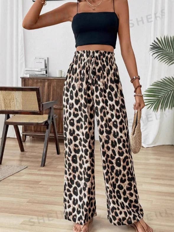 Leopard print wide leg casual straight leg pants