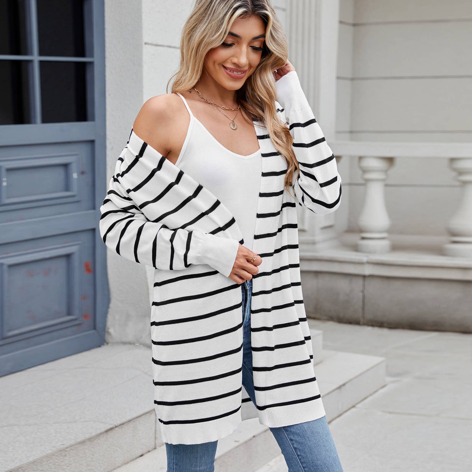 Long knitted striped cardigan without buttons