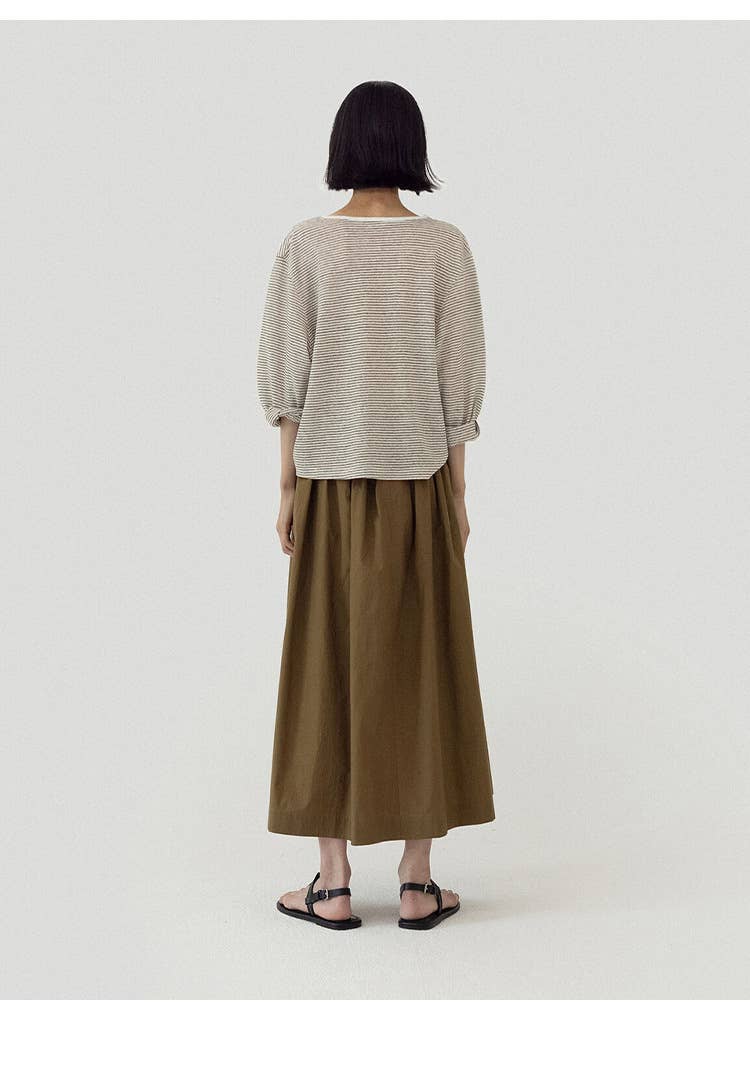 Long sleeve loose cotton linen striped T-shirt