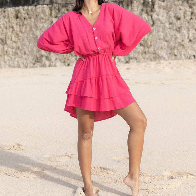 LONG SLEEVE SOLID COLOR COTTON LINEN DRESS