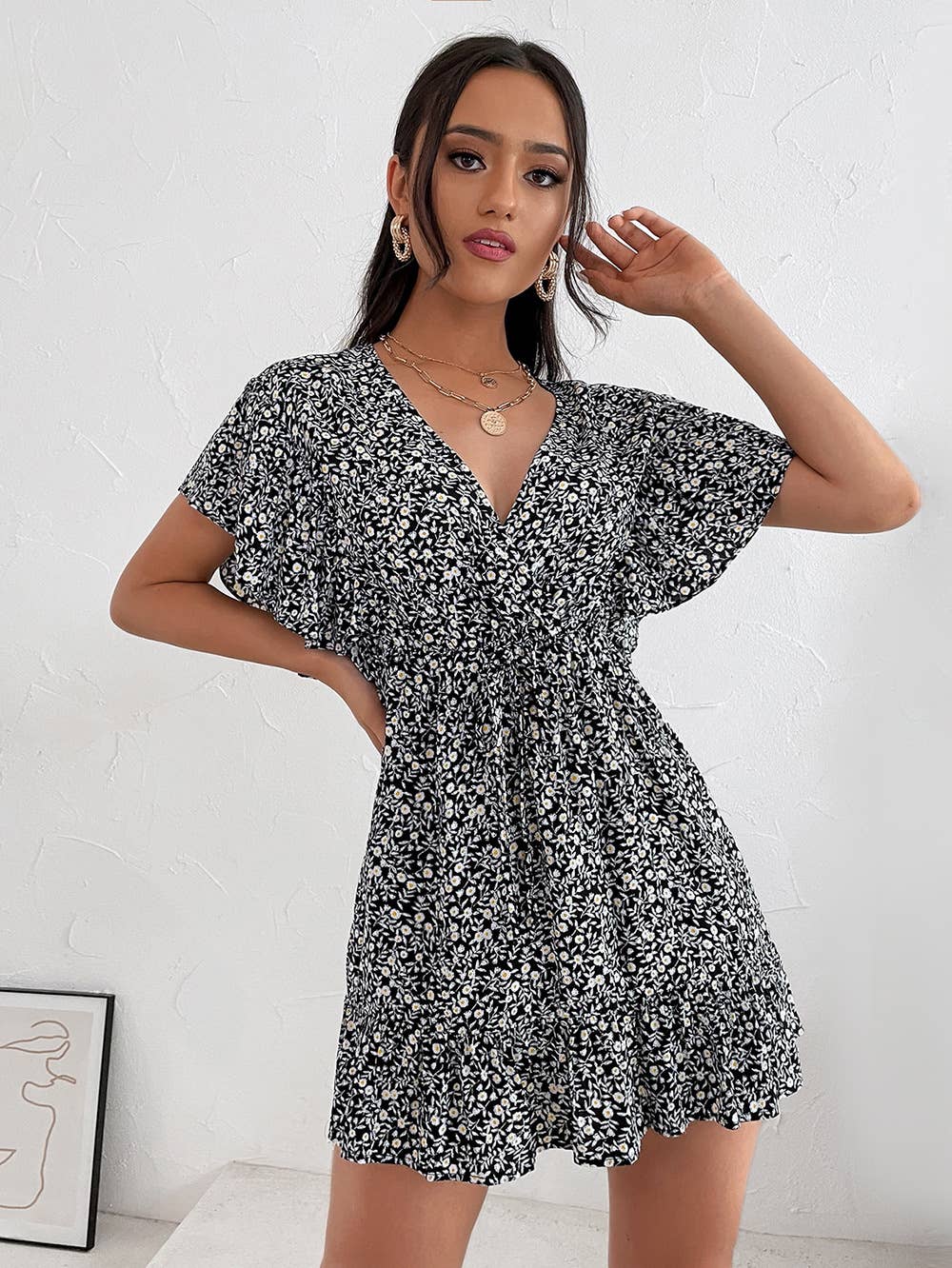 PINCHED WAIST FLORAL V-NECK CHIFFON BEACH DRESS