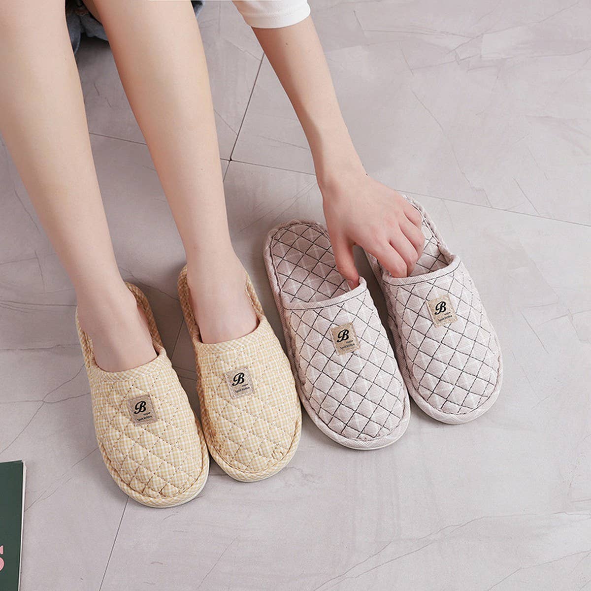Plaid Cotton Closed-Toe Slippers with Rubber Sole_CWSHF0201